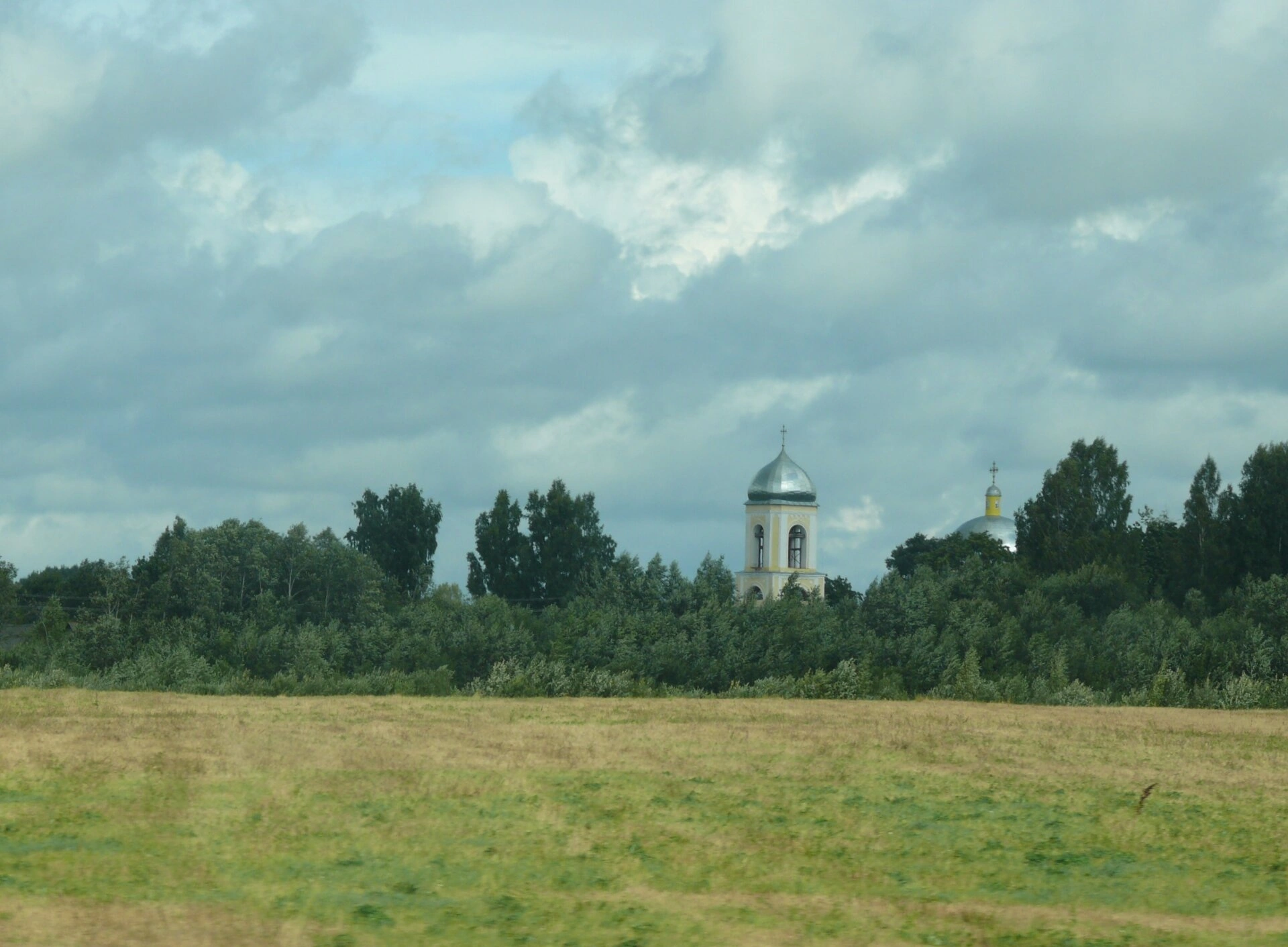 На снимке доминирует колокольня храма, увенчанная традиционным куполом с православным крестом. Справа от колокольни просматривается основной объём церкви с ещё одним куполом, частично скрытый кронами деревьев. Архитектурный облик храма характерен для русских православных церквей, построенных в этом регионе.