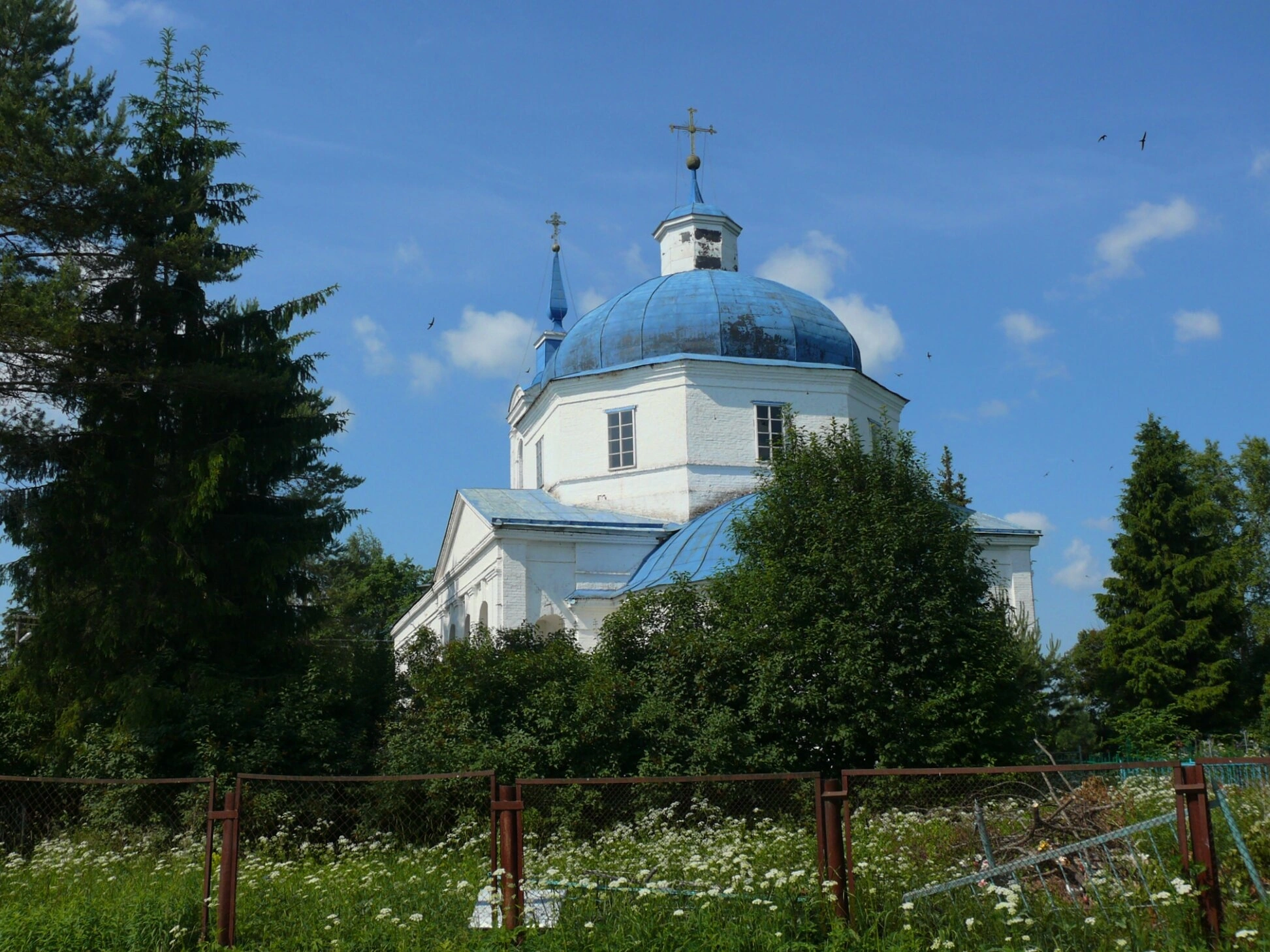 На переднем плане фотографии виден металлический забор, отделяющий церковную территорию от поля, усыпанного белыми полевыми цветами. Этот элемент подчеркивает расположение храма в сельской местности и создает ощущение уединенности и покоя.
