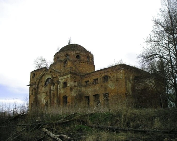 На представленной фотографии запечатлена Церковь Успения Пресвятой Богородицы, расположенная в селе Чернышено Калужской области. Святыня находится в полуразрушенном состоянии, что свидетельствует о сложной исторической судьбе православного храма.