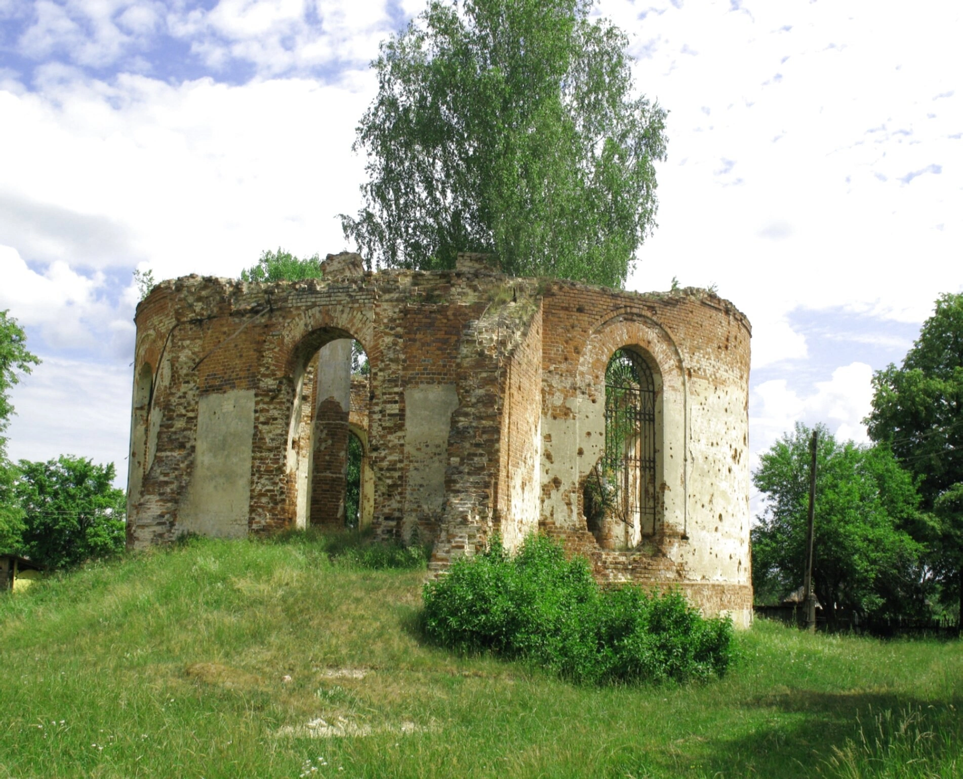 На фотографии запечатлены руины Церкви Успения Пресвятой Богородицы, расположенной в селе Чернышено Думиничского района Калужской области. Каменный храм был возведён в 1844 году генералом от инфантерии Иваном Никитичем Скобелевым на месте погребения его супруги Надежды Дмитриевны Скобелевой, скончавшейся в 1838 году. Строительство продолжалось с 1838 по 1843 годы, и результатом стал храм с каменной колокольней и оградой, при котором также находилась библиотека и каменная часовня .