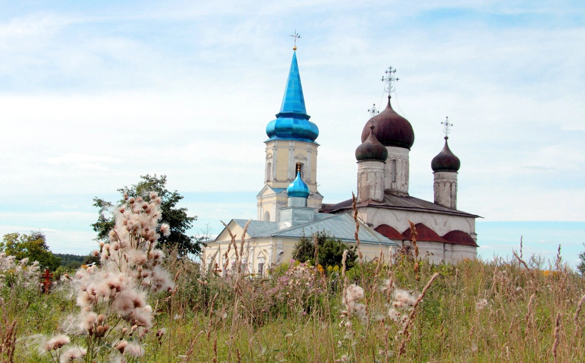 На фотографии храм предстает в своем великолепии под голубым небом с легкими облаками, символизируя непреходящую духовную ценность православной культуры. Ярко-синий цвет одного из куполов гармонично сочетается с окружающим природным ландшафтом, а пушистые семена растений на переднем плане создают особую лирическую атмосферу, подчеркивая священную тишину и благодать этого намоленного места.