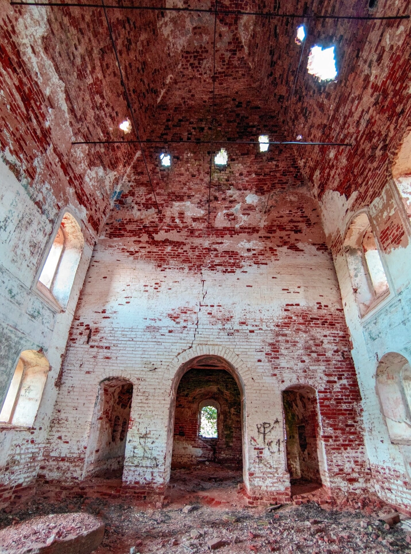 Сводчатые потолки и арочные проемы, характерные для православной церковной архитектуры, сохранили следы былого величия. Стены из красного кирпича, частично сохранившие фрагменты белой штукатурки, пронизаны глубокими трещинами. Через разрушенную кровлю в помещение проникают лучи дневного света, освещая внутреннее пространство храма.
