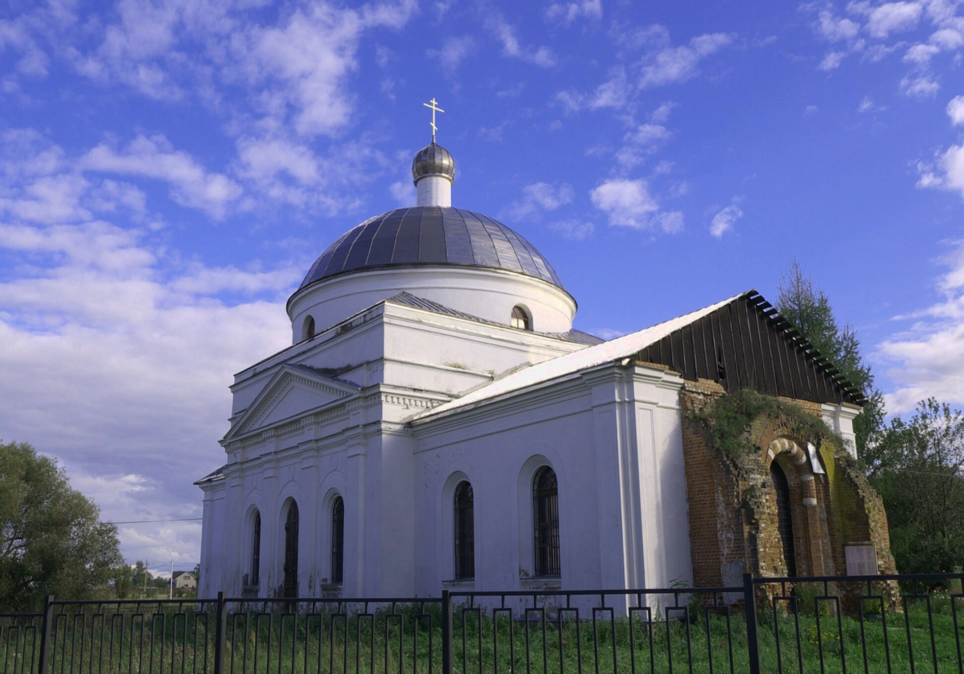 Фотография позволяет рассмотреть детали постройки: арочные оконные проёмы, элементы декора фасада и следы времени на кирпичных стенах. Некоторое разрушение кладки указывает на сложную историю храма в годы лихолетья, однако его внешний облик сохраняет благолепие и величие. Храм располагается в живописной местности, что подчёркивает его духовную значимость как дома молитвы и центра православной жизни в округе.