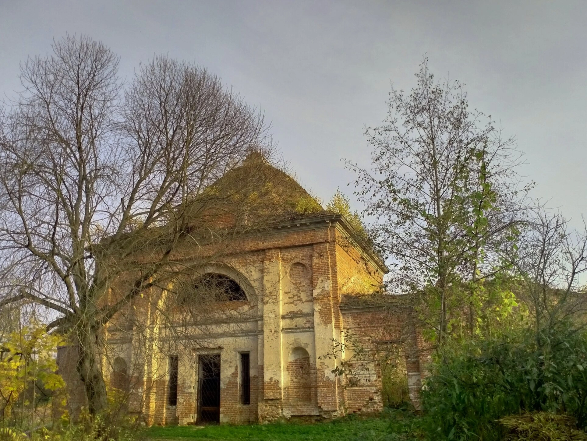 Храм окружён естественной средой: густой растительностью, деревьями с обнажёнными ветвями и пожухлой осенней травой. Это указывает на то, что съёмка проводилась в осеннее время года. Пасмурное серое небо создаёт ровное, мягкое освещение, которое усиливает ощущение умиротворённой печали и исторической глубины.