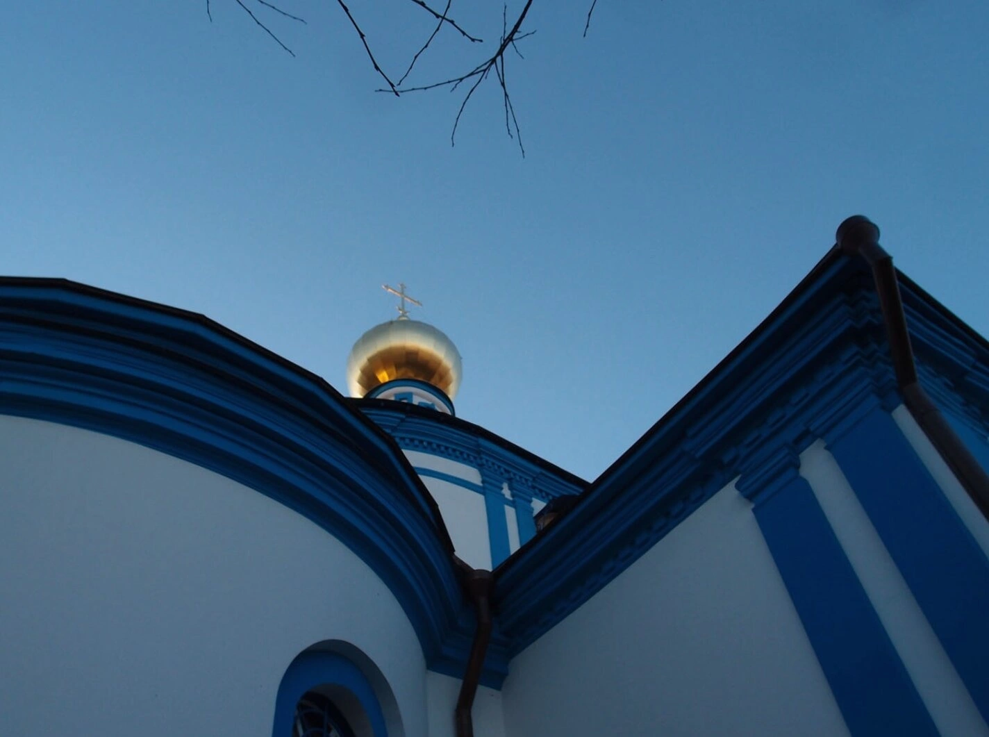 Главным акцентом снимка выступает величественный купол храма, увенчанный золоченым крестом, символизирующим победу Господа нашего Иисуса Христа над смертью. Небесно-голубая окраска купола, традиционно означающая Пресвятую Богородицу и небесную чистоту, гармонично сочетается с белоснежными стенами самого здания, создавая образ лёгкости и устремлённости к горнему миру.