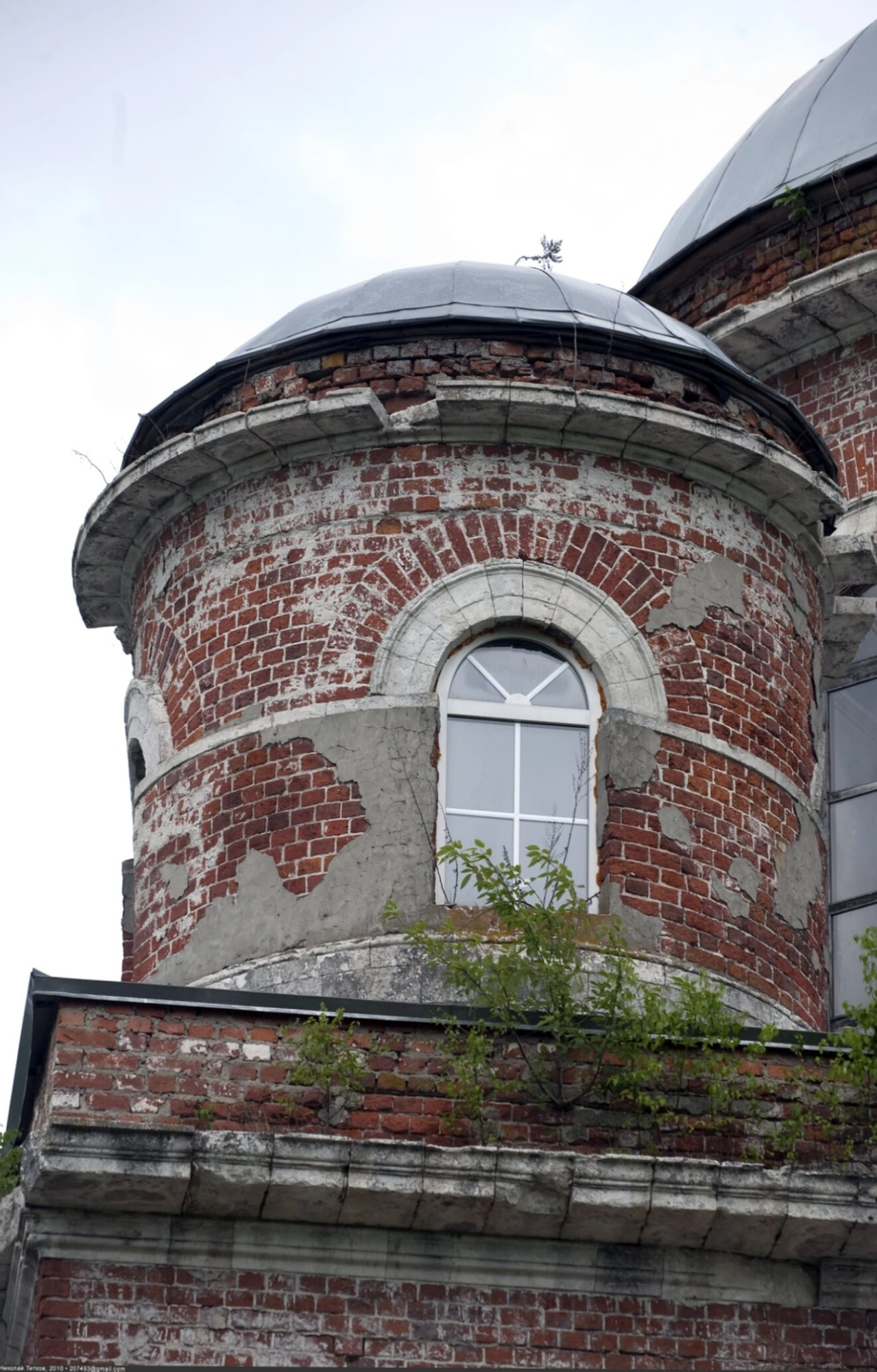 На снимке хорошо просматривается характерный для православного зодчества барабан, увенчанный традиционным куполом, который символизирует небесную сферу и устремленность верующих к Горнему миру. Фрагмент кирпичной кладки демонстрирует следы временного разрушения, что свидетельствует о необходимости сохранения и восстановления этого духовного памятника.