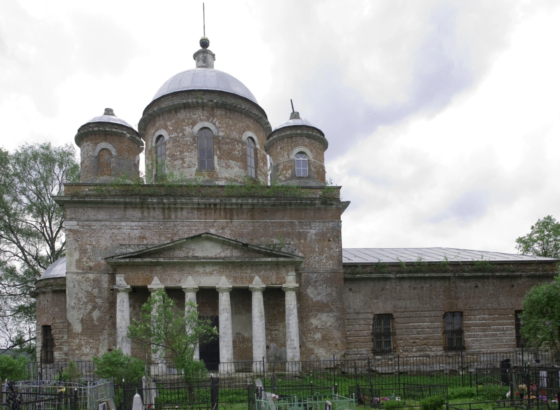 При детальном рассмотрении фотографии явственно видны следы разрушительного действия времени и людского забвения. Святыня пребывает в плачевном состоянии: кладка стен местами обветшала, элементы декора частично утрачены, а оконные проёмы зияют пустотой. Пробивающаяся на стенах и кровле растительность лишь подчёркивает протяжённость периода запустения. Окружающая территория храма напоминает о бывшем здесь некогда приходском кладбище — виднеются остатки оград и надгробий, поросшие травой.