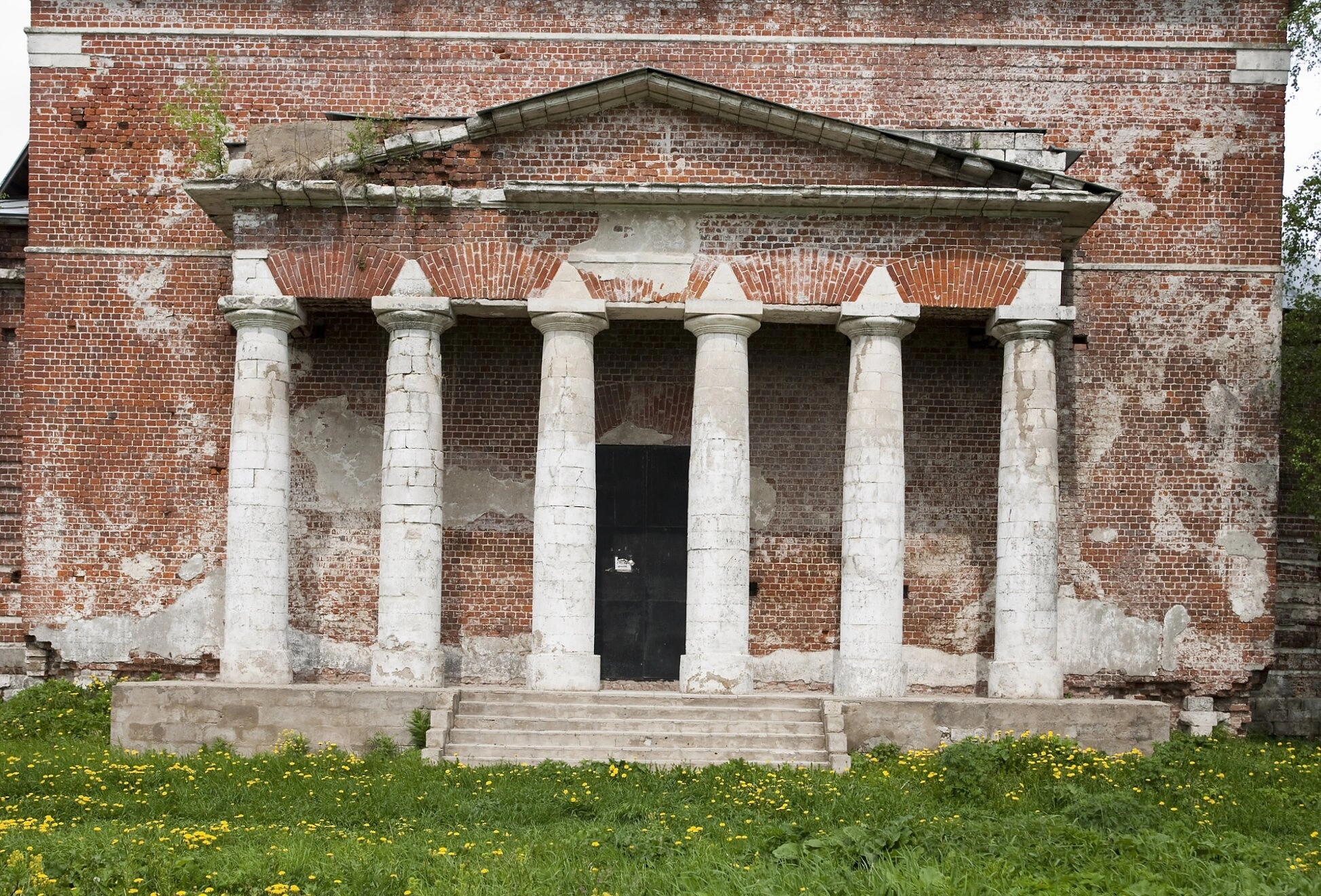 Фасад здания, выполненный из красного кирпича, несёт на себе следы времени: местами кладка обветшала и осыпалась, обнажив слои штукатурки. Центральным архитектурным элементом является монументальный классический портик с шестью строгими колоннами тосканского ордера, которые поддерживают массивный фронтон. Верхняя часть фронтона частично утрачена, что свидетельствует о длительном отсутствии реставрационных работ.