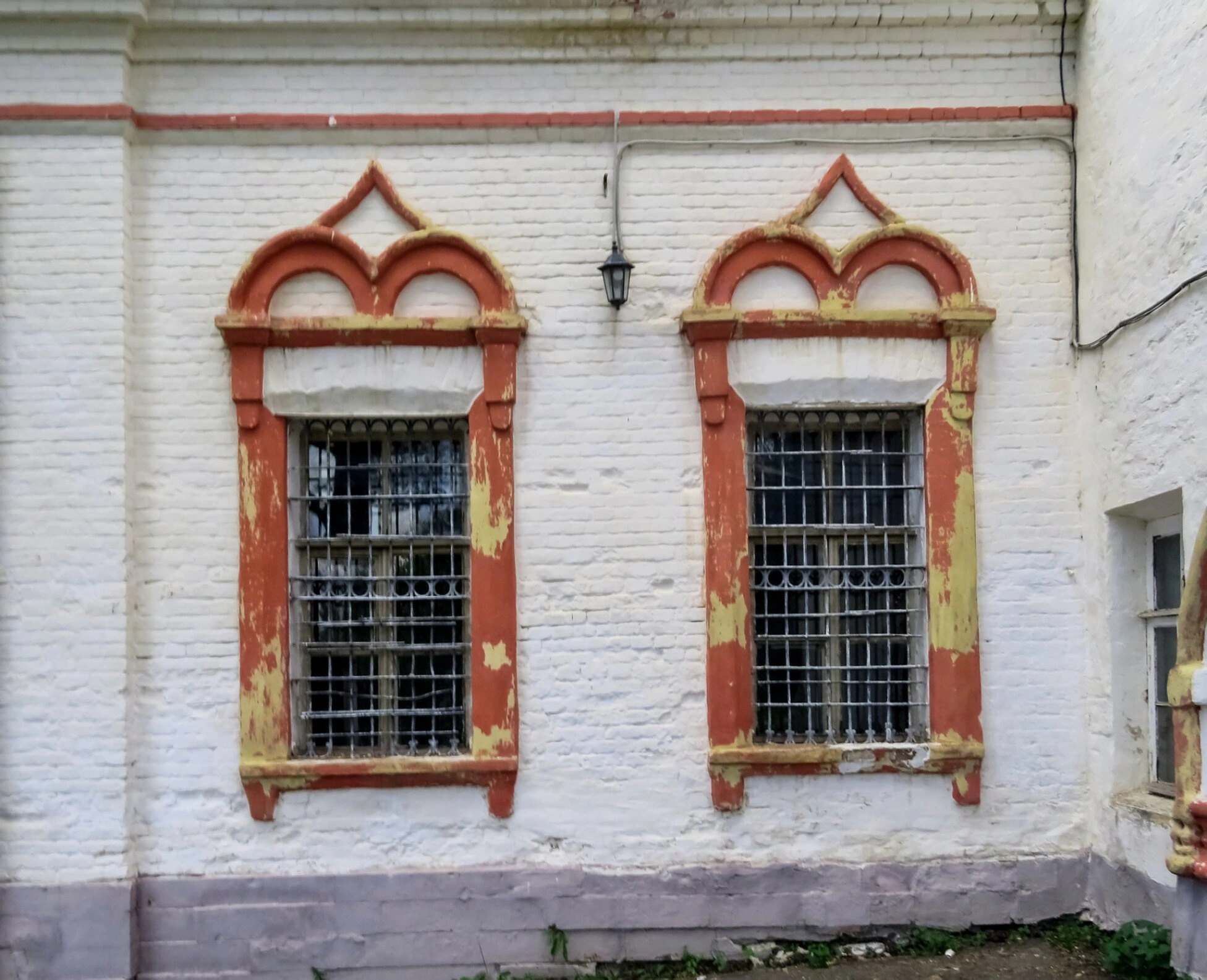 На снимке хорошо видны два арочных окна, характерных для церковной архитектуры того периода. Окна украшены наличниками традиционного красного цвета, обильно декорированными резными элементами. Защиту проёмов обеспечивают кованые металлические решётки, подчёркивающие древность и основательность сооружения.