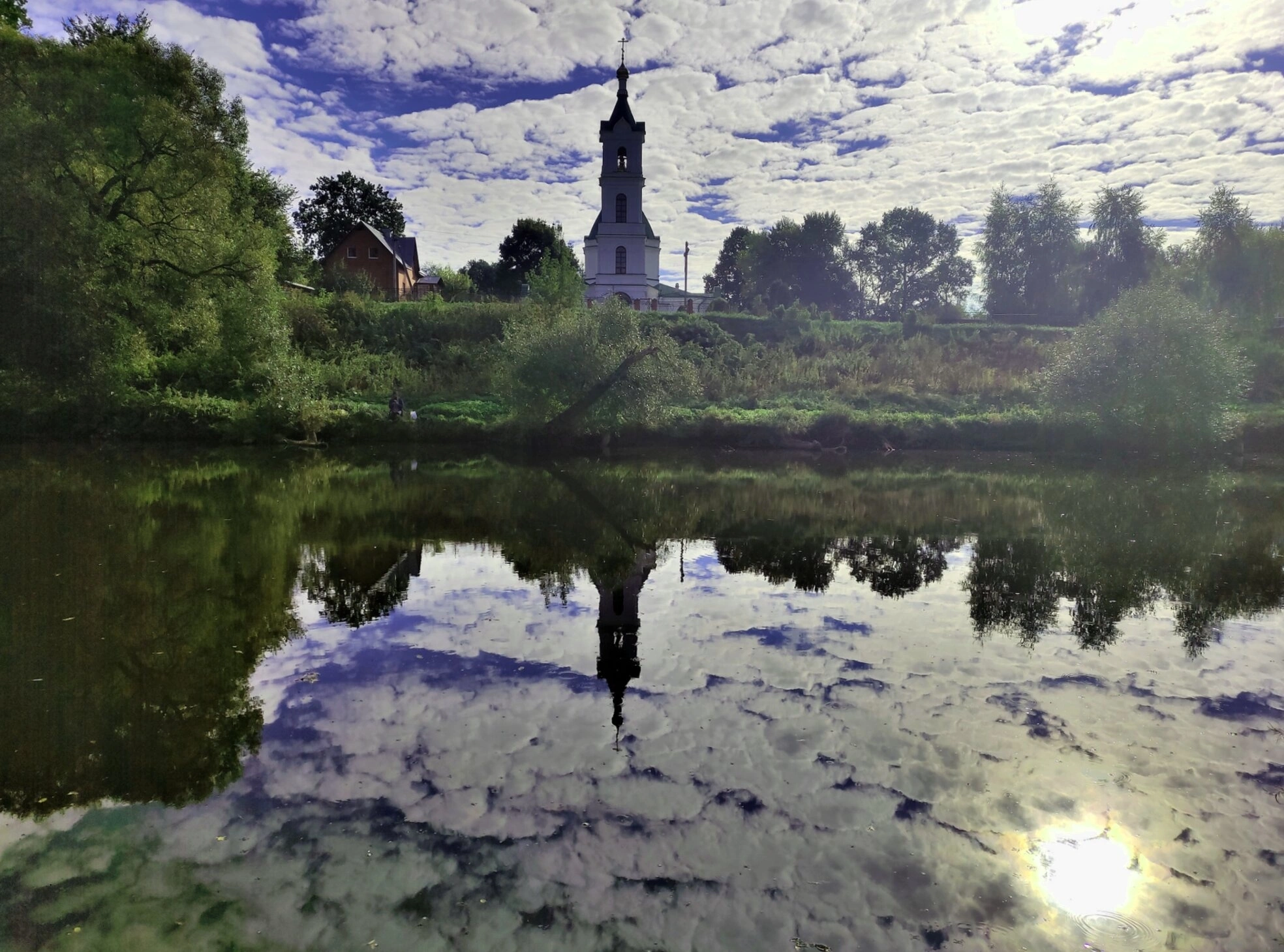 На представленной фотографии запечатлён величественный образ Церкви Успения Пресвятой Богородицы, расположенной в селе Успенское Орехово-Зуевского района Московской области. Храм живописно отражается в спокойных водах реки Нара, создавая ощущение неземного благолепия и вечной духовной красоты. Высокая многоярусная колокольня, увенчанная шпилем, устремляется в небеса, символизируя молитвенное предстояние перед Господом.