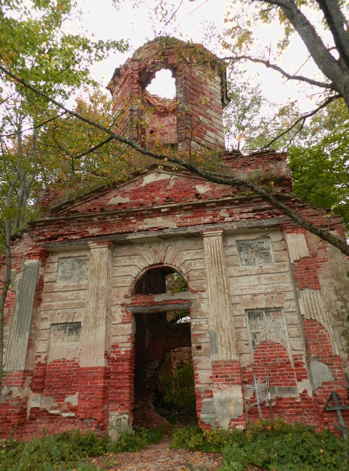 На представленной фотографии запечатлена руинированная Церковь Успения Пресвятой Богородицы, расположенная на территории древнего городища в деревне Выбор Псковской области. Каменный храм был возведен в 1807 году на средства помещика Рокотова, купцов Развозовых и других прихожен на месте прежней сгоревшей деревянной церкви. Значительный вклад в строительство внес император Александр I, пожертвовавший на благое дело тысячу рублей .