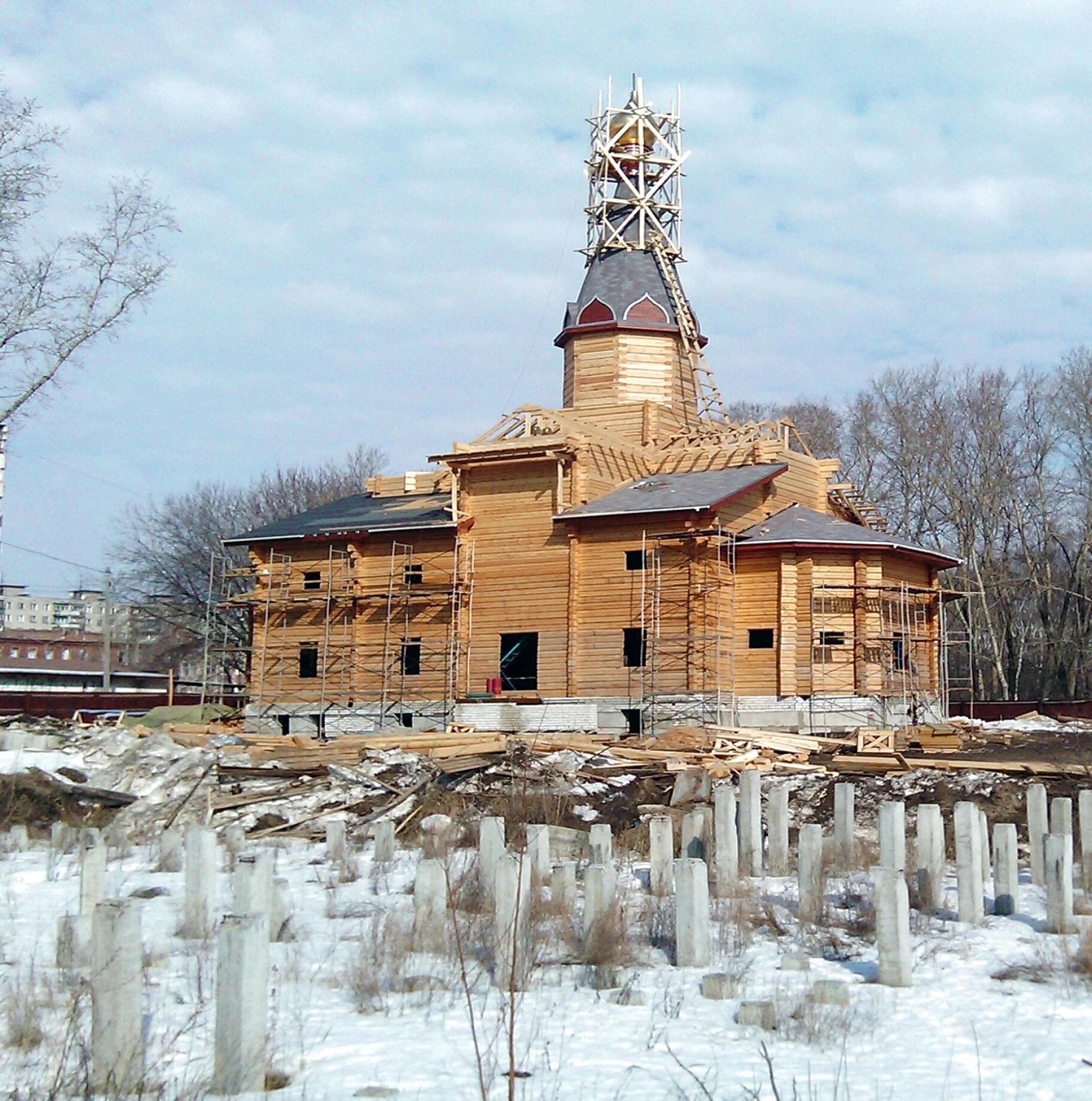 На представленной фотографии запечатлён важный этап в истории православной жизни Нижнего Новгорода — строительство храма в честь иконы Пресвятой Богородицы «Умиление» в микрорайоне Молитовка. Деревянное здание церкви, возводимое с применением традиций русского храмового зодчества, увенчано высоким шатровым куполом, который символизирует устремлённость верующих к горнему миру. В момент съёмки сооружение плотно окружено строительными лесами, что подчёркивает активную фазу работ.