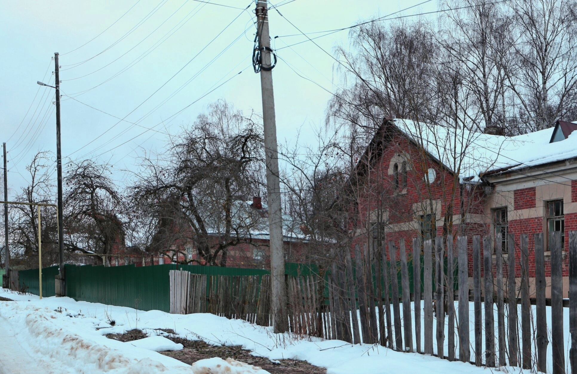 На переднем плане изображена заснеженная дорога, по обеим сторонам которой установлены заборы: традиционный деревянный из кольев и более современный из зеленого профнастила. За ограждениями видны голые деревья, чьи ветви покрыты инеем, что характерно для русской зимы в центральных регионах России.