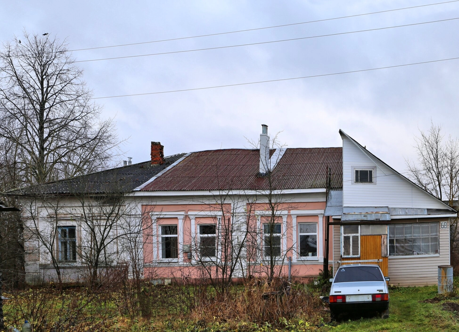 На представленной фотографии запечатлена православная церковь, расположенная в деревне Маршово Писцовского сельского поселения Ивановской области. Храм представляет собой архитектурный комплекс, состоящий из основного здания и пристройки. Основной объем церкви выполнен с бледно-розовым фасадом, украшенным белыми наличниками вокруг оконных проемов. Кровля храма покрыта красной черепицей, что характерно для церковной архитектуры данного региона.