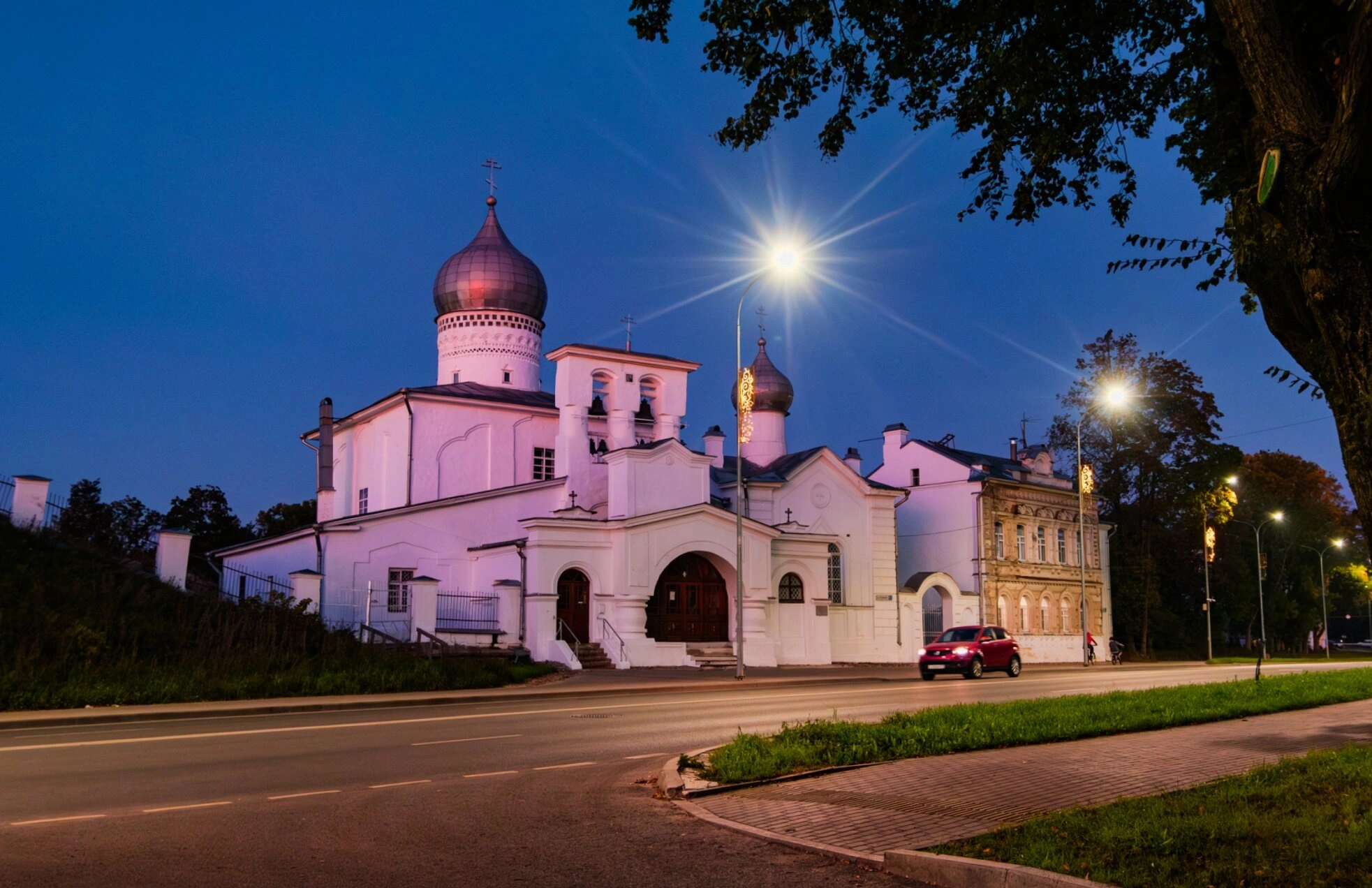 На представленной фотографии запечатлён величественный образ древнего православного храма — Церкви Преподобного Варлаама Хутынского, что на Званице, в городе Пскове. Ночная съёмка подчёркивает благоговейную тишину и духовное величие этого святого места, выделяя его светлые стены на фоне тёмного неба и подчёркивая монументальность архитектурных форм.