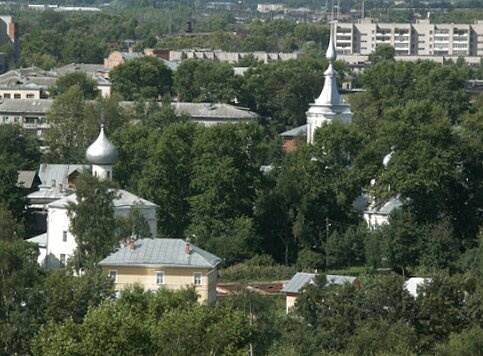 На представленной фотографии запечатлен панорамный вид православной Церкви Варлаама Хутынского, расположенной в исторической части города Вологды. Снимок выполнен с высоты, что позволяет оценить величие храмового сооружения и его гармоничное вписывание в городской ландшафт.
