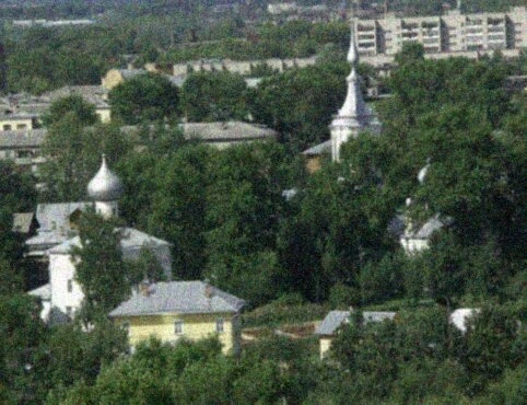 На фотографии запечатлена панорама Вологды с доминирующим в композиции храмом преподобного Варлаама Хутынского. Церковь, утопающая в зелени деревьев, представляет собой выдающийся памятник церковной архитектуры, расположенный в исторической части города по улице Засодимского, 14А.