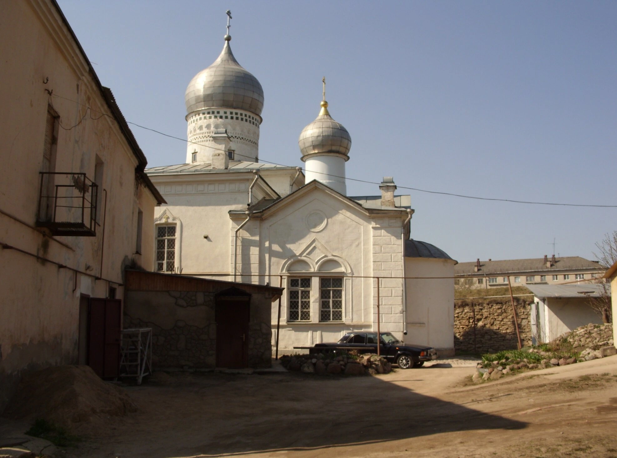 Фасад здания украшен скромным, но выразительным декором: арочными оконными проёмами, обрамлёнными традиционными для псковичей бровками, и лопатками, членящими стены. На снимке видно, что храм сохранил свою историческую фактуру и стоит в окружении частной застройки. Присутствие автомобиля у его стен свидетельствует о том, что святыня ныне действует и является живым центром православной духовной жизни, соединяя в себе многовековую историю и современность.