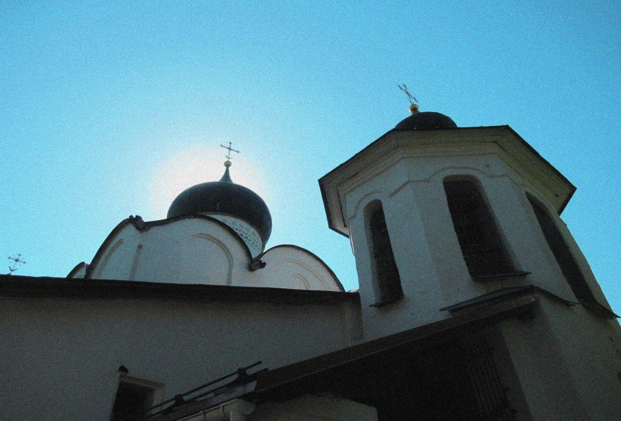 На фотографии также просматривается часть колокольни или башни с арочными окнами и еще одним куполом, что свидетельствует о сложной объемно-пространственной композиции храмового комплекса. Белоснежные стены церкви создают выразительный контраст с темными куполами и лазурным небом, подчеркивая древность и духовную значимость этого места.