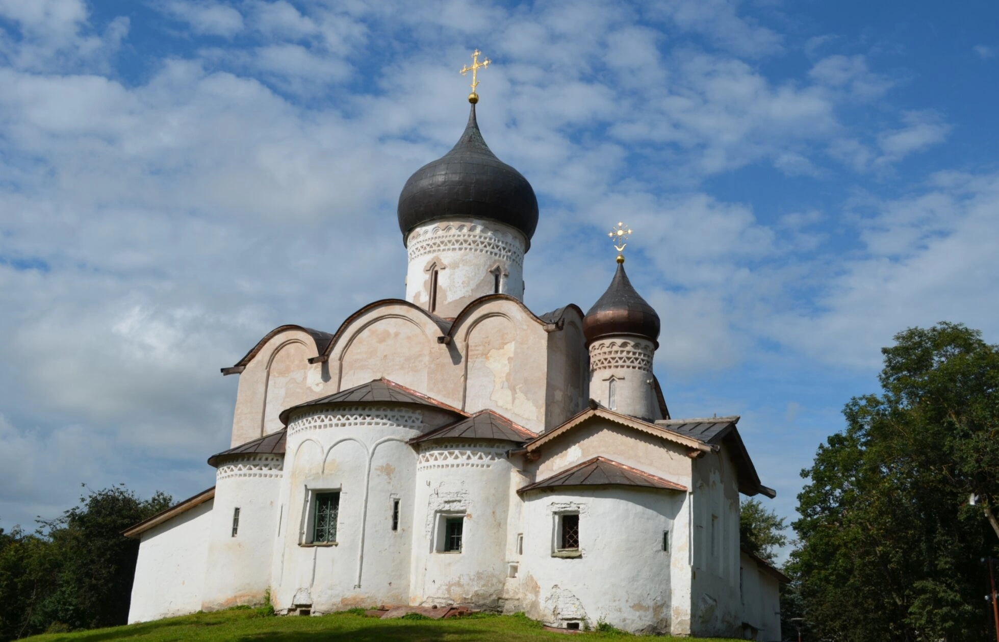 На представленной фотографии запечатлён величественный образ Церкви Святителя Василия Великого на Горке, расположенной в историческом центре Пскова. Этот древний православный храм, основанный в XV столетии, является выдающимся памятником псковской церковной архитектуры и находится под охраной государства как объект культурного наследия.