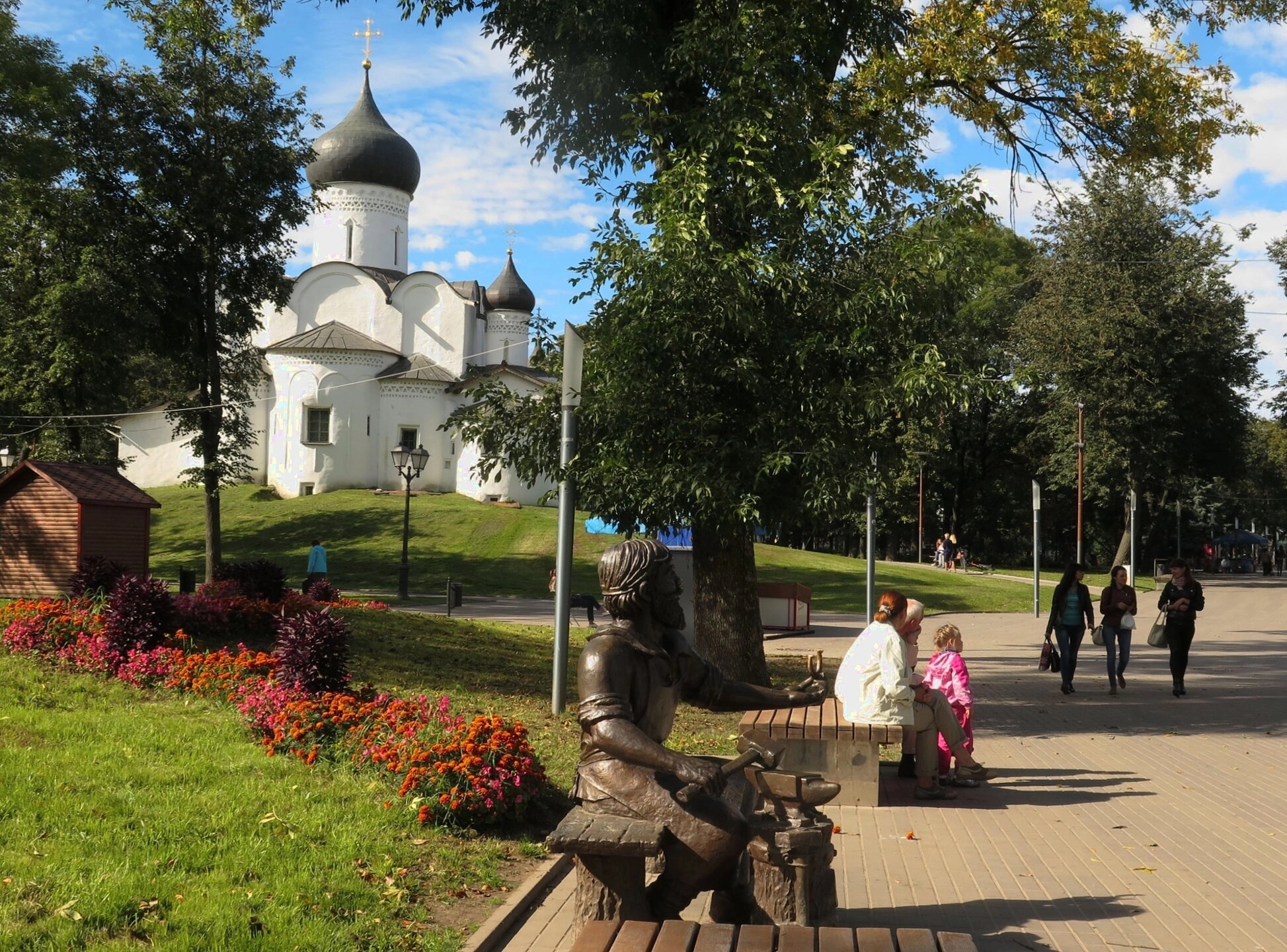 Жизнь в парке идёт своим чередом: по дорожкам неспешно прогуливаются горожане и гости Пскова, а на скамейке рядом со скульптурой присели отдохнуть мать с дитем. Лазурное небо с легкими белоснежными облаками завершает эту светлую и мирную картину, наполненную благодатью и тихой радостью. Данный снимок не просто фиксирует вид на памятник федерального значения XV столетия, но и передаёт особую атмосферу этого святого места, где переплетаются история, вера и повседневная жизнь древнего русского города.