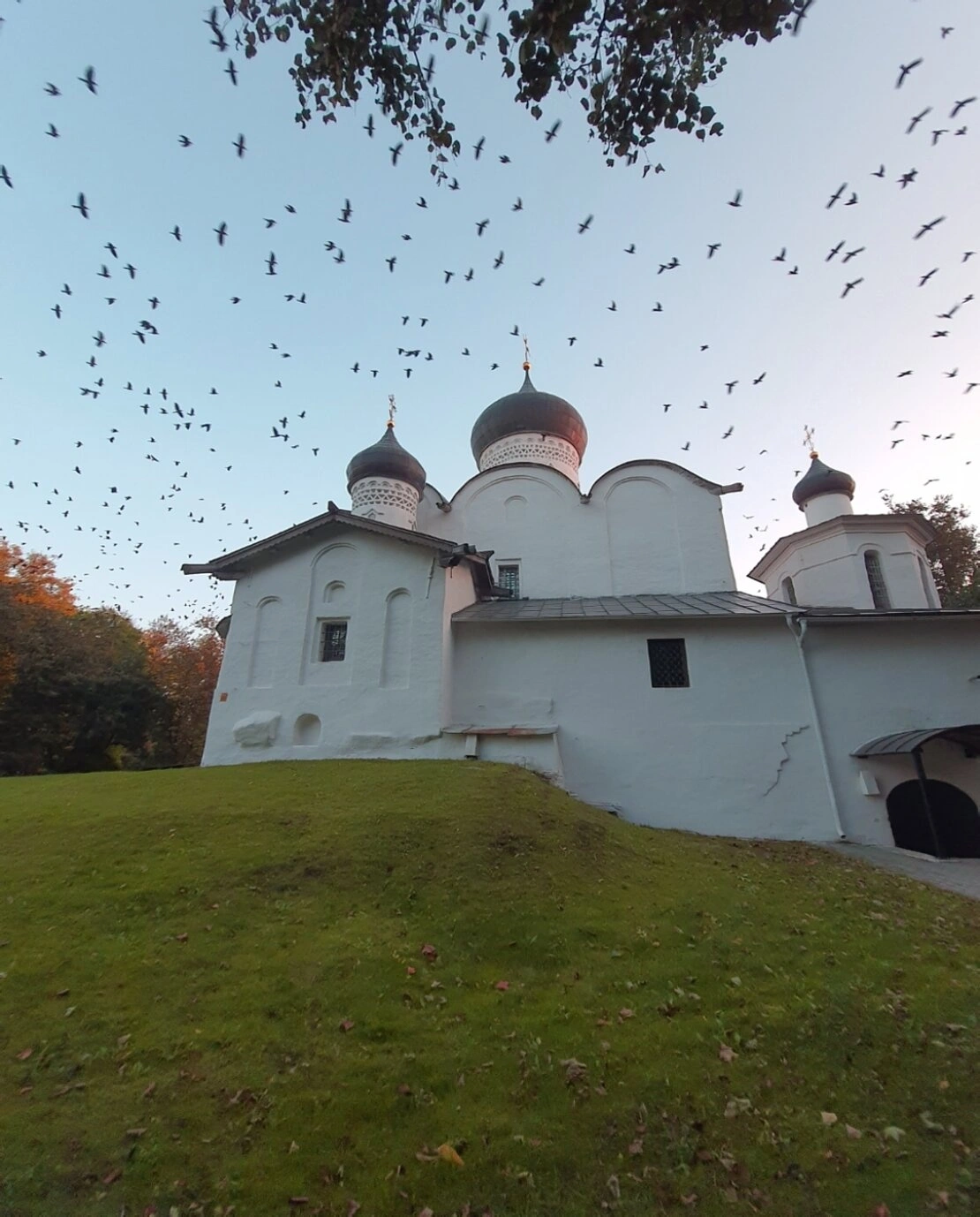 На представленной фотографии запечатлён древний православный храм — Церковь Василия Великого на Горке, расположенная в историческом центре Пскова. Снимок уникален тем, что над святыней в небесной вышине парит большая стая птиц, что создаёт особое возвышенное настроение и символизирует связь земли и неба.