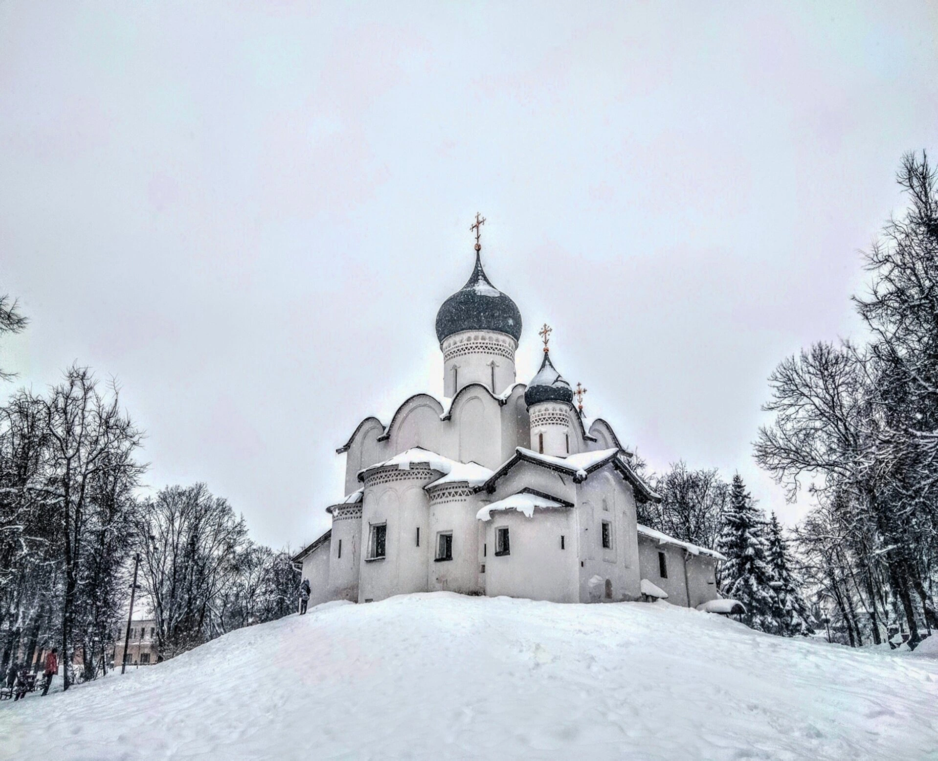 На представленной фотографии запечатлена древняя Церковь Василия Великого на Горке, что в граде Пскове. Святыня, возведённая на возвышенности у реки Великой, предстаёт в зимнем убранстве, припорошённая чистым снегом, под безоблачным небом. Белокаменные стены храма и его стройный силуэт ярко выделяются на фоне зимнего пейзажа, напоминая о вечности и незыблемости православной веры.