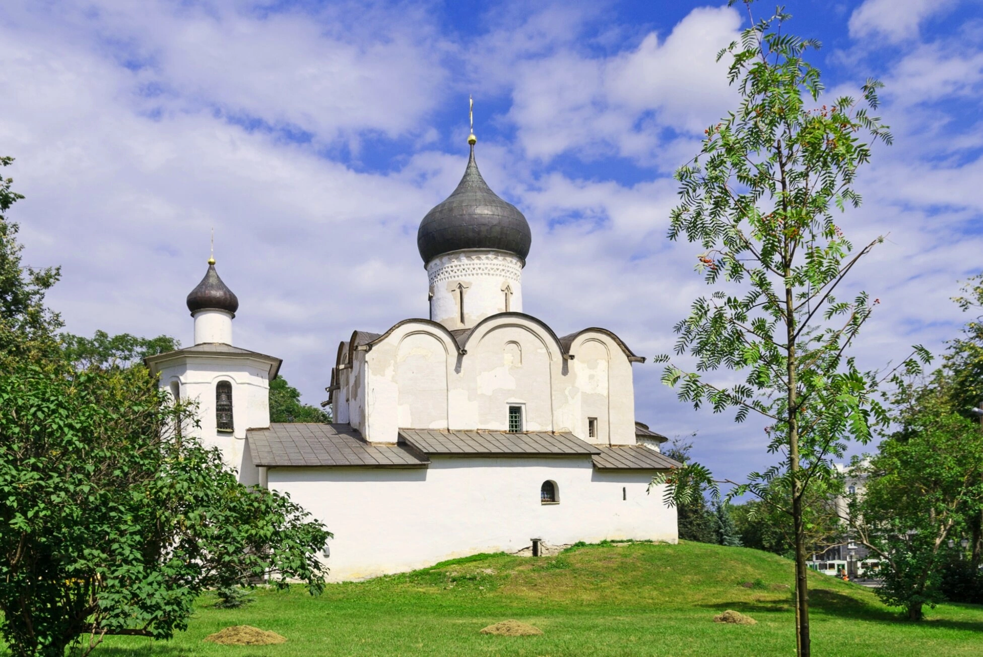 На представленной фотографии запечатлён величественный православный храм — Церковь Святого Василия Великого на Горке, одна из жемчужин древнего Пскова. Святыня живописно расположена на историческом возвышении — Васильевской горке в Среднем городе, откуда открывается благодатный вид на её белоснежные стены и золочёные главы.