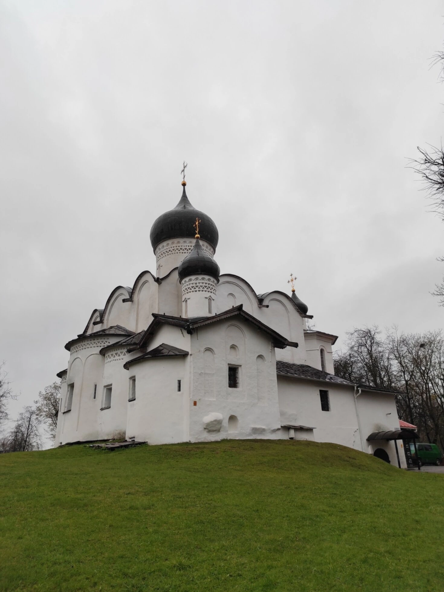 На фотографии запечатлён древний православный храм — Церковь Святителя Василия Великого на Горке, расположенная в историческом центре Пскова. Этот выдающийся памятник псковского зодчества был возведён в XV столетии и освящён в честь святителя Василия Кесарийского. Храм располагается на возвышенности, что подчёркивает его стройный и величественный силуэт, характерный для псковской архитектурной школы.