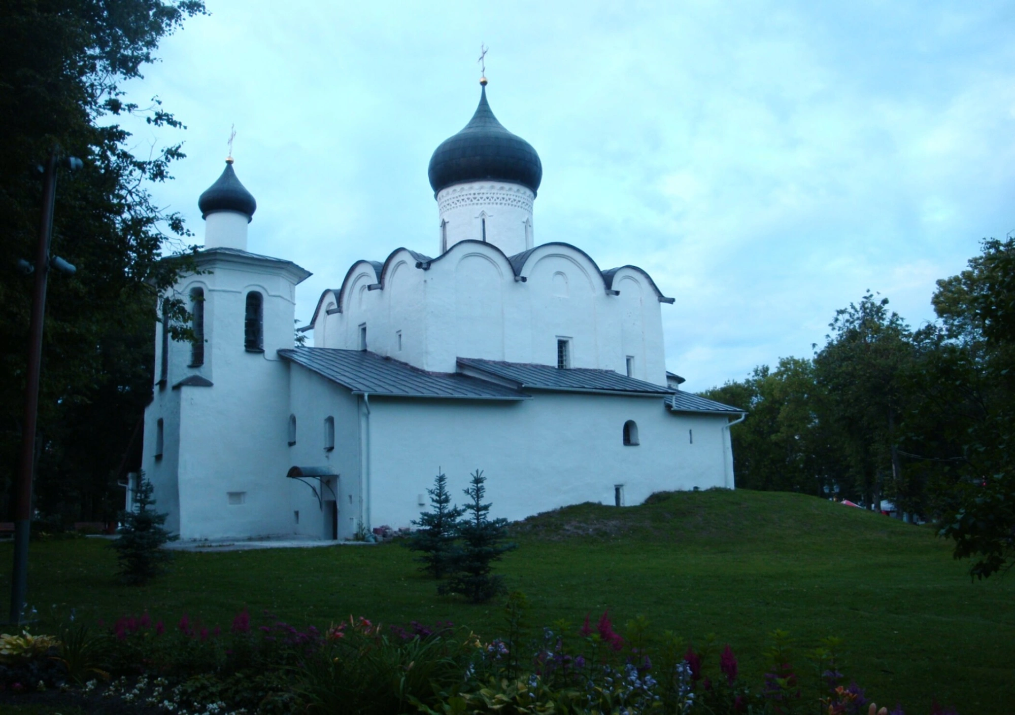 Храм гармонично вписан в окружающий ландшафт. На переднем плане фотографии видна ухоженная клумба с яркими цветами, а вокруг простирается зелёная сень деревьев сквера, подчёркивающая уединённость и духовную сосредоточенность этого места. Снимок сделан в час мягкого, рассеянного света, вероятно, в пасмурный день или на закате, что придаёт каменным стенам особую теплоту и глубину, а всему образу — настроение тишины и благоговейного покоя. Этот храм-памятник, переживший века, и поныне остаётся действующей святыней и одним из узнаваемых символов древнего Пскова.