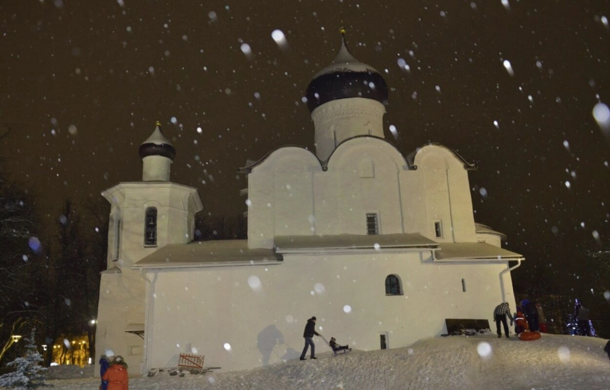 На переднем плане и у подножия церкви видны силуэты прихожан и горожан. Одни неспешно прогуливаются, другие катают детей на санках, что свидетельствует о том, что храм даже в такой поздний час и в непогоду остаётся духовным центром, местом притяжения и живой истории. Данный кадр не просто фиксирует архитектурный памятник, но передаёт глубокую атмосферу русской зимы и неразрывную связь народа со своей верой и культурным наследием.