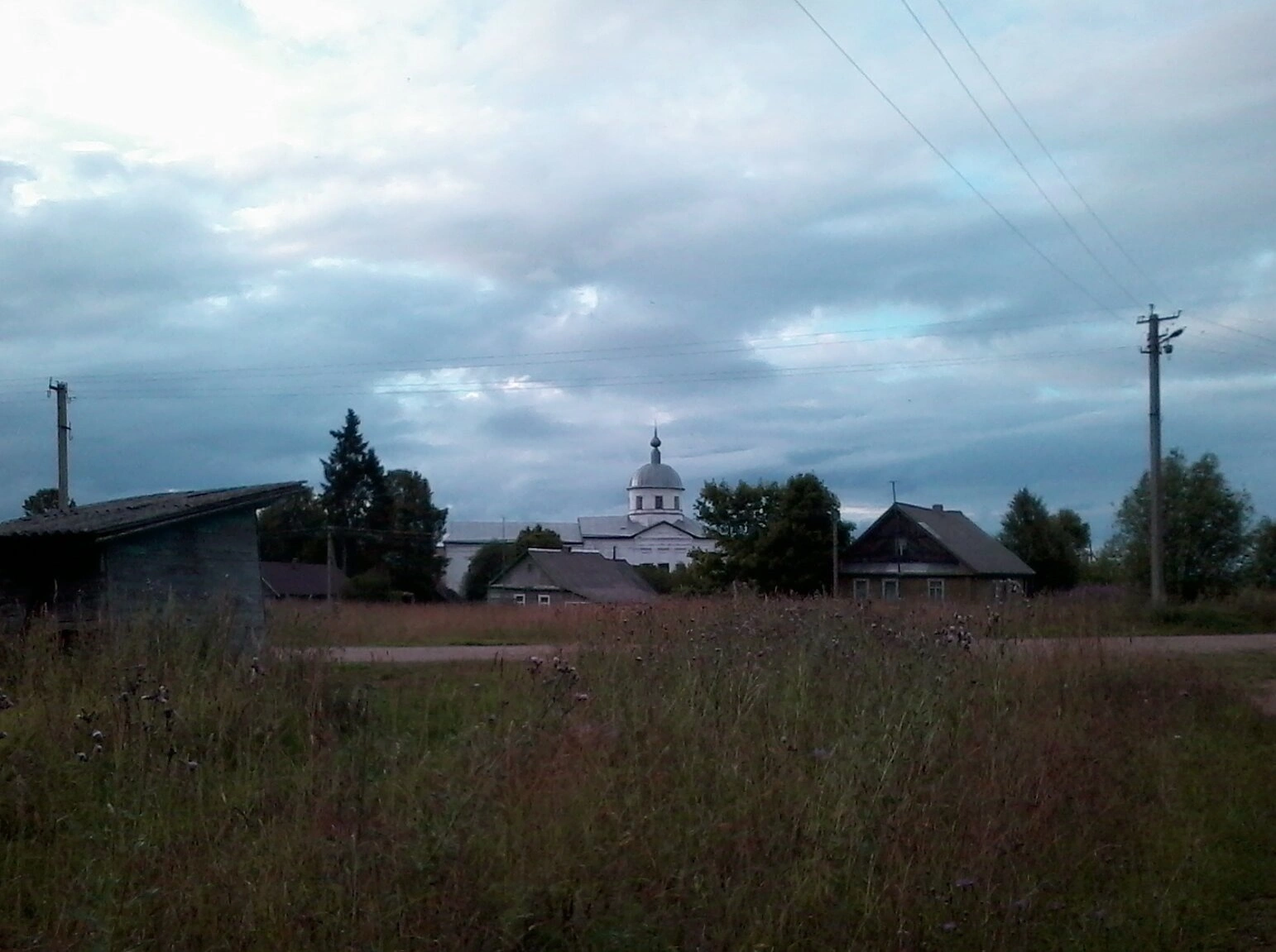 На переднем плане фотографии наблюдается густой травяной покров, характерный для сельской местности Русского Севера. Средний план композиции включает традиционные деревянные дома и хозяйственные постройки местных жителей, между которыми пролегает грунтовая дорога. Часть церковного здания скрыта за кронами деревьев, что создает естественное обрамление для святыни.