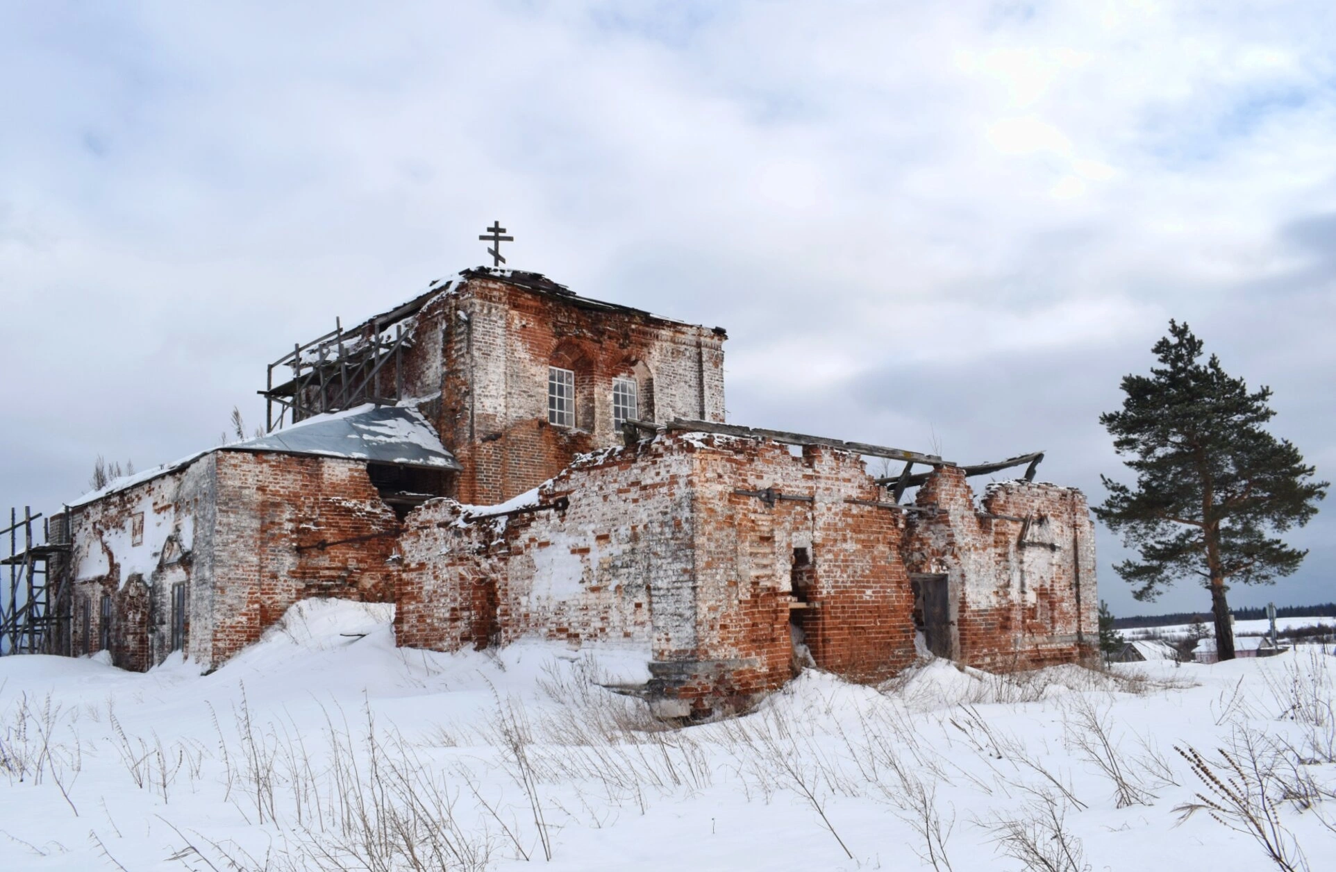 Снимок сделан в зимний период, когда снежный покров мягко окутывает землю вокруг храма, создавая атмосферу тишины и благоговения. Несмотря на разрушительное действие времени, в облике церкви угадываются черты традиционного северного храмового зодчества.