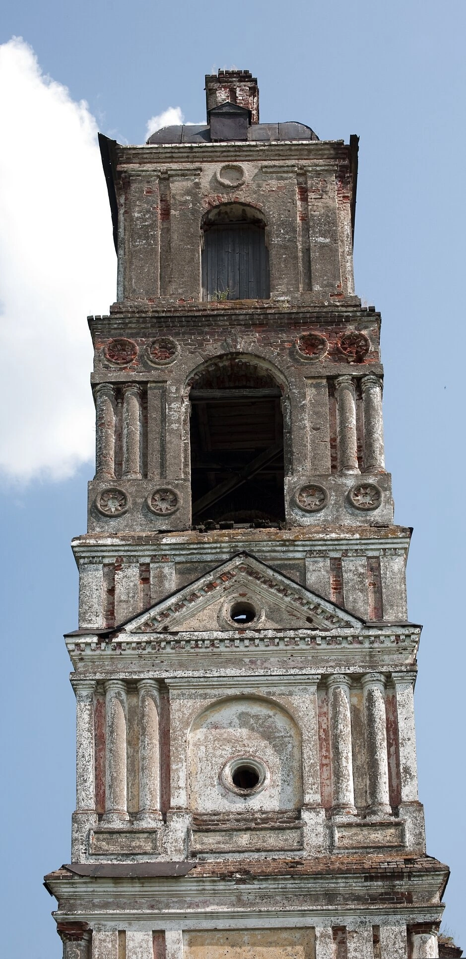 Колокольня, изображённая на снимке, представляет собой ярусное сооружение, завершающееся шатром с главкой. Подобные колокольни были неотъемлемой частью храмовых комплексов и служили для созыва верующих на богослужение. Местоположение храма в живописной местности Владимирского края подчёркивает гармонию творения рук человеческих и Божьего мира.