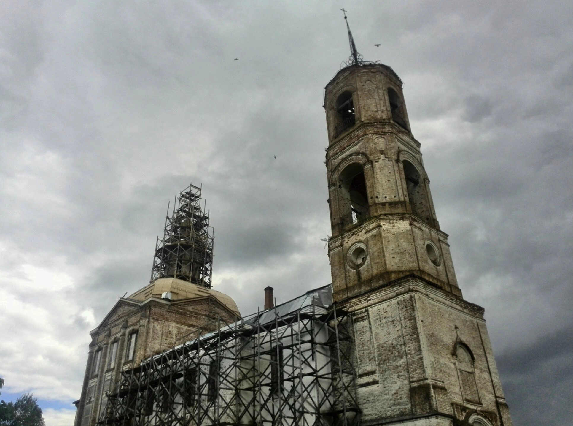 Церковь представляет собой высокий четверик, увенчанный мощным шатром с главкой, к которому прирублена низкая алтарная часть. С западной стороны к основному объёму примыкает обширная трапезная и крытое крыльцо. Несмотря на временные леса, на фотографии читается стройный, устремлённый в небо силуэт храма, гармонично вписанный в окружающий лесной пейзаж.