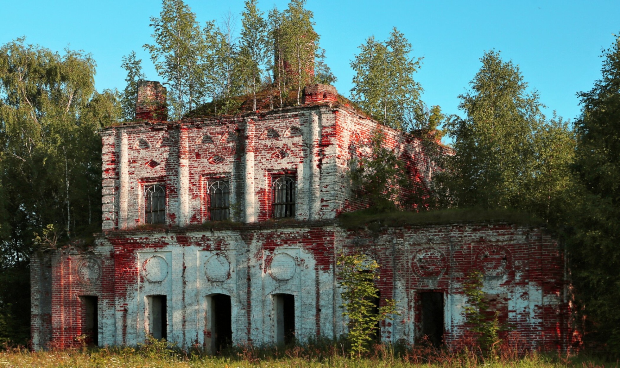 На представленной фотографии запечатлена Церковь великомученика Димитрия Солунского, расположенная на погосте Димитрия Солунского в деревне Хлебницы Кольчугинского района Владимирской области. Храм находится в полуразрушенном состоянии, что свидетельствует о сложной исторической судьбе православной святыни.