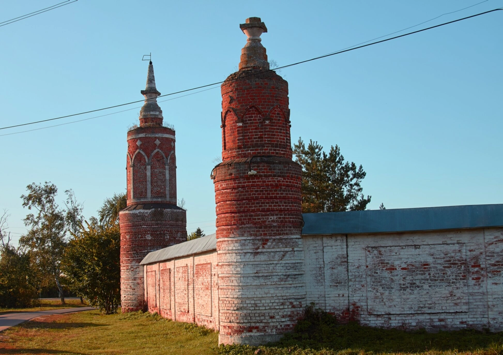 Архитектурный ансамбль включает две distinctive башни, выполненные из красного кирпича. Более высокая и стройная колокольня увенчана остроконечным завершением, тогда как вторая башня, расположенная ближе к foreground, обладает меньшей высотой и шириной, с усеченной верхней частью. Обе сооружения демонстрируют признаки временного воздействия и требуют реставрационного вмешательства.