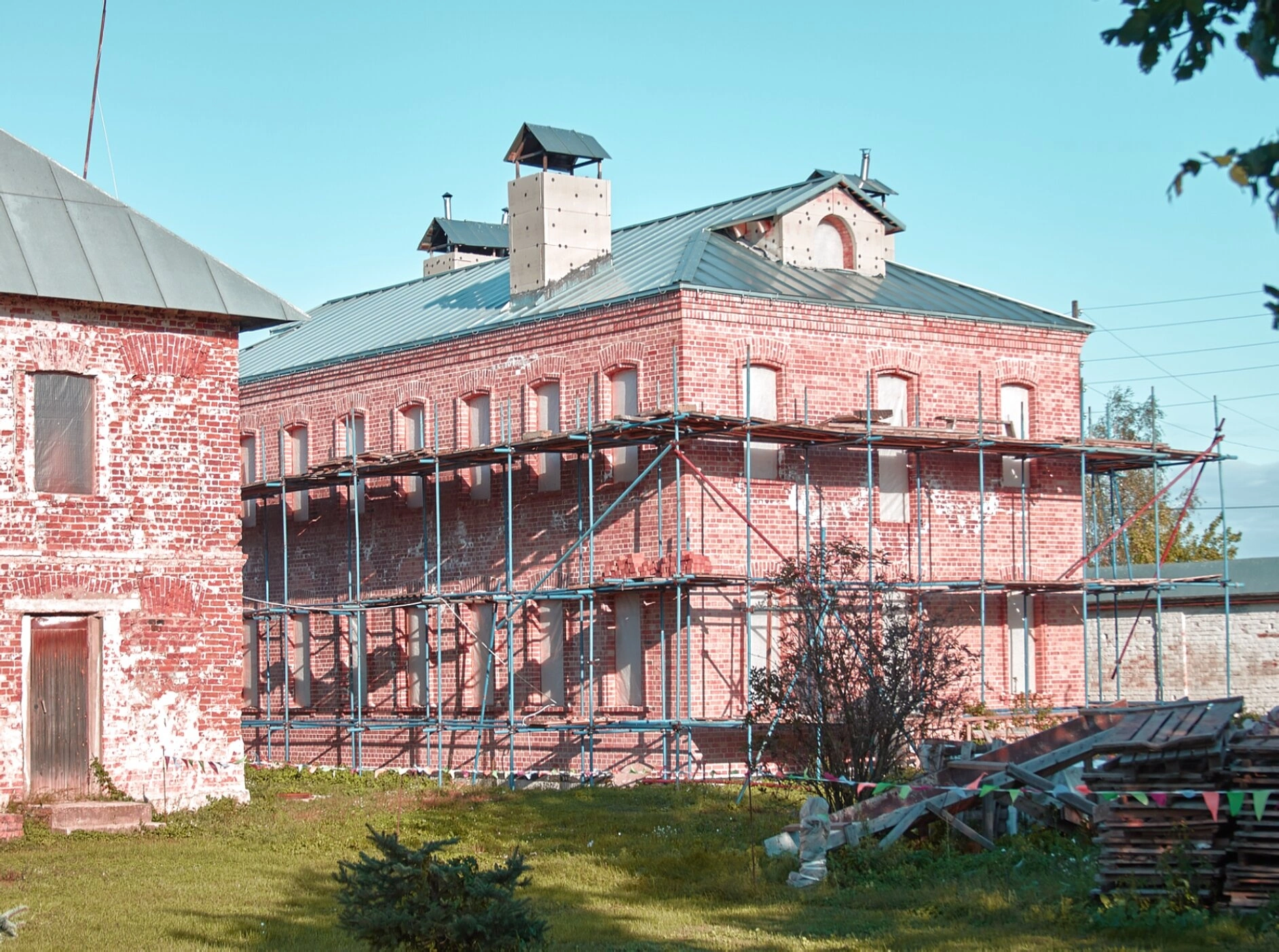 В момент съемки храм пребывает в стадии реставрационных работ, о чем свидетельствуют установленные металлические строительные леса, частично охватывающие фасад. Некоторые оконные проемы временно защищены пленкой или фанерными щитами от воздействия внешней среды. Кровля здания покрыта серым металлическим листом и увенчана двумя кирпичными дымовыми трубами с металлическими колпаками.
