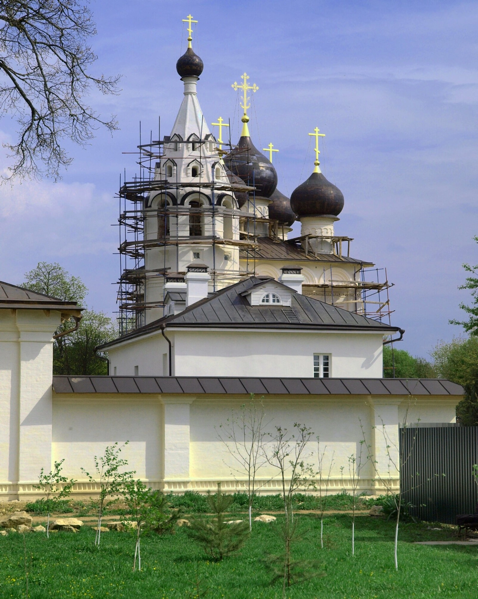 На представленной фотографии запечатлена Церковь Входа Господня в Иерусалим, расположенная в историческом центре древнего города Вереи Московской области. Храм находится в стадии активной реставрации, о чём красноречиво свидетельствуют строительные леса, окружающие его центральный купол и колокольню.