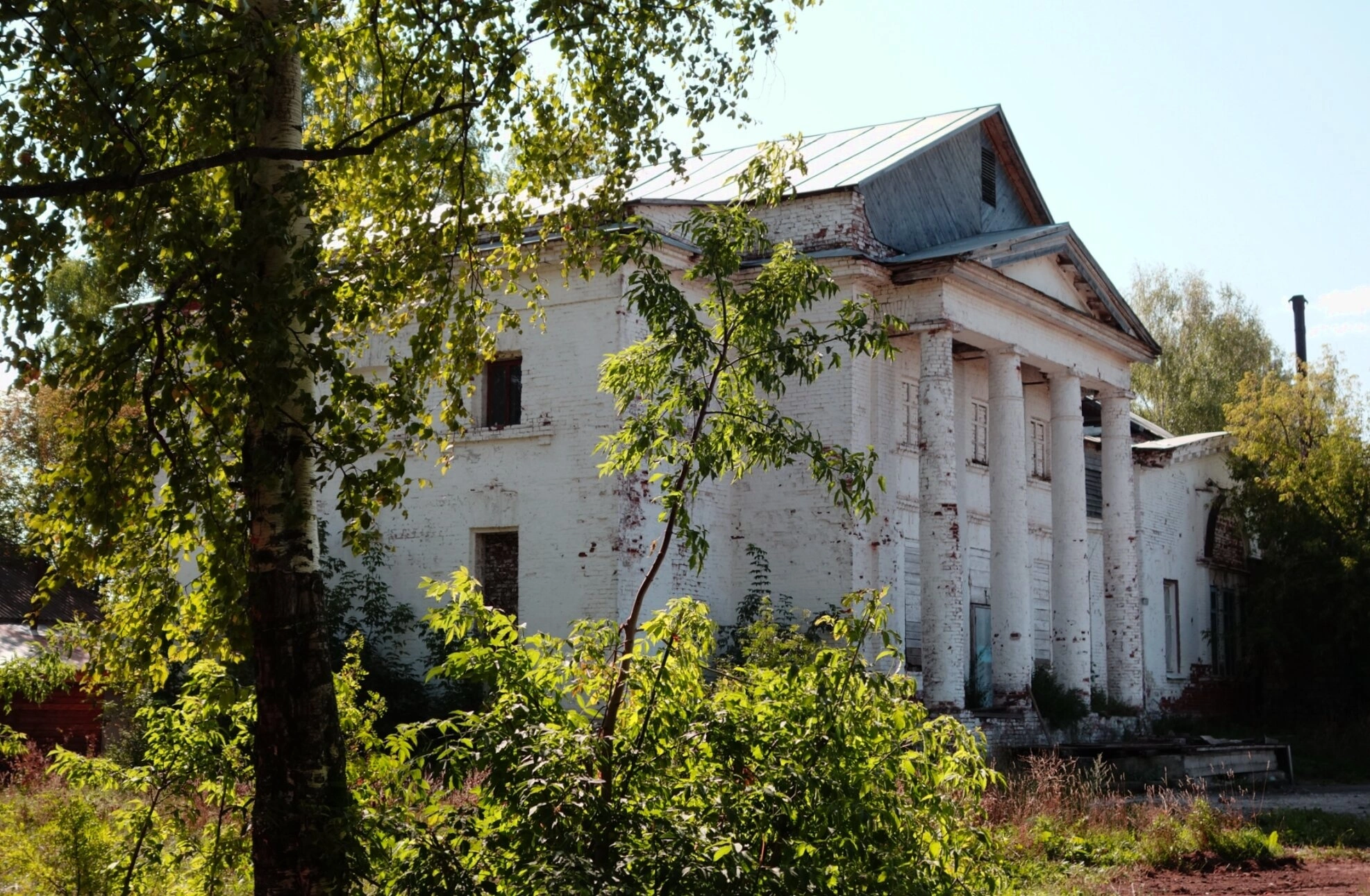 Внешний вид святыни вызывает чувство благоговейной грусти. Храм, предназначенный для молитвы и единения верующих, пребывает в запустении. Его крыша покрыта серым металлом, а вокруг разрослась буйная растительность: высокие деревья и густая трава скрывают часть фасада, подчёркивая оторванность от мира. Снимок сделан в ясный солнечный день, и лучи света, падающие на стены, контрастно выделяют благородные линии архитектуры на фоне окружающей зелени, напоминая о былой красоте и духовном предназначении этого места.