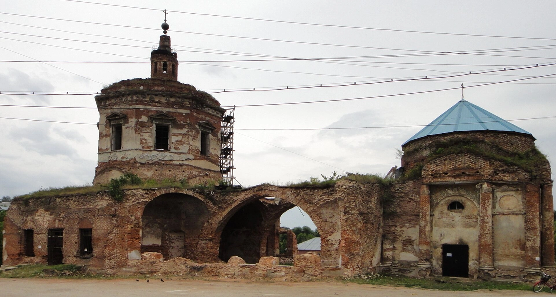 Храм, возведённый из красного кирпича, ныне пребывает в состоянии тяжёлого запустения. От былого величия сохранились лишь фрагменты мощных стен с арочными проёмами, остатки сводов и элементы куполов. Один из куполов, венчающий основной объём, укрыт синим материалом, пытающимся уберечь остатки конструкции от дальнейшего разрушения. Второй купол, более высокий, принадлежит колокольне, которая всё ещё устремляется в небо, напоминая о молитвенном назначении этого места.
