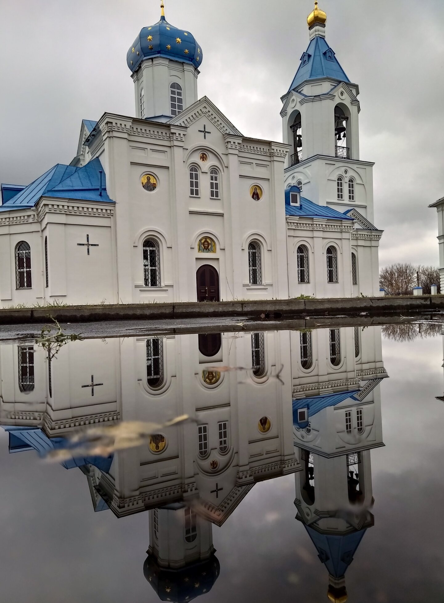 На снимке храм предстаёт во всей своей красоте: белоснежные стены символизируют духовную чистоту, лазурные кровли напоминают о небесной благодати, а золотые купола со крестами свидетельствуют о победе Христа над смертью. Особую художественную ценность фотографии придаёт отражение храмового здания в луже, создающее удивительный симметричный образ, где земное встречается с небесным.