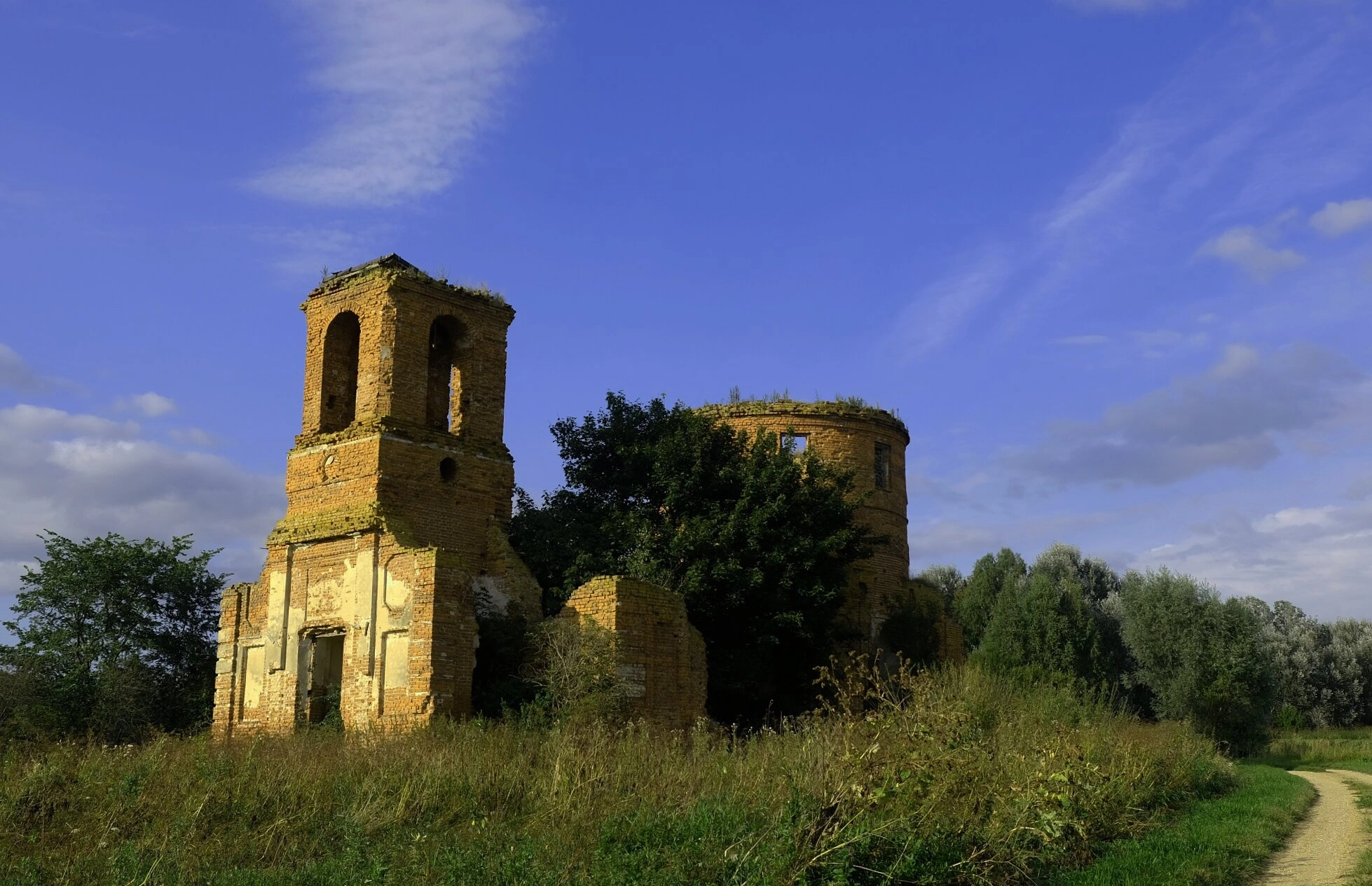 Церковь окружена типичным для сельской местности ландшафтом: грунтовая дорога подходит к храму, а полевая растительность постепенно скрывает следы человеческого присутствия. Деревья и кустарники, проросшие сквозь кирпичную кладку, создают особую атмосферу забвения и утраты.