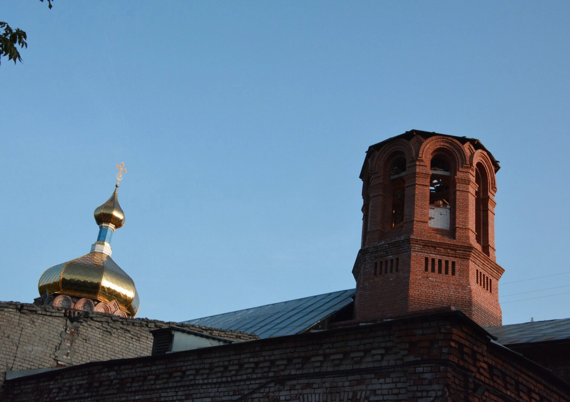 Справа от купола изображена часть колокольни, сооружённой из красного кирпича и украшенной арочными проёмами, характерными для церковной архитектуры XIX века. Колокольня, являющаяся неотъемлемой частью храмового комплекса, выполнена в традиционном стиле, гармонирующем с основным объёмом церкви. Арочные окна-звоны предназначены для распространения колокольного звона во время богослужений и церковных праздников.