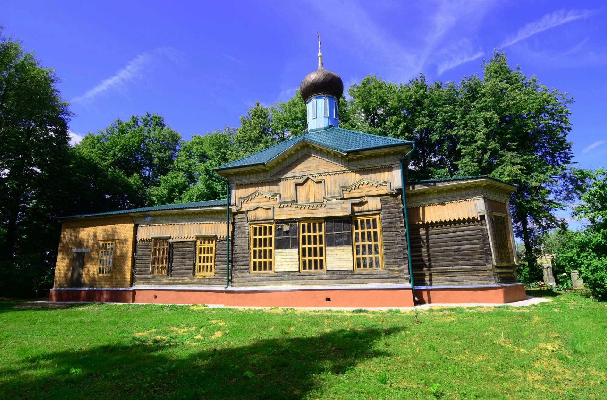 На фотографии запечатлён деревянный храм Воскресения Христова в деревне Купрово Можайского района Московской области. Здание сооружено из горизонтально уложенных бревён, его двускатная крыша покрыта зелёным металлическим листом. Над центральной частью возвышается синий барабан, увенчанный тёмным куполом с православным крестом. Фасад украшен резными деревянными элементами, а высокие прямоугольные окна обрамлены деревянными рамами. Нижняя часть храма и фундамент окрашены в красный цвет. Церковь стоит на зелёной лужайке, окружённой деревьями.