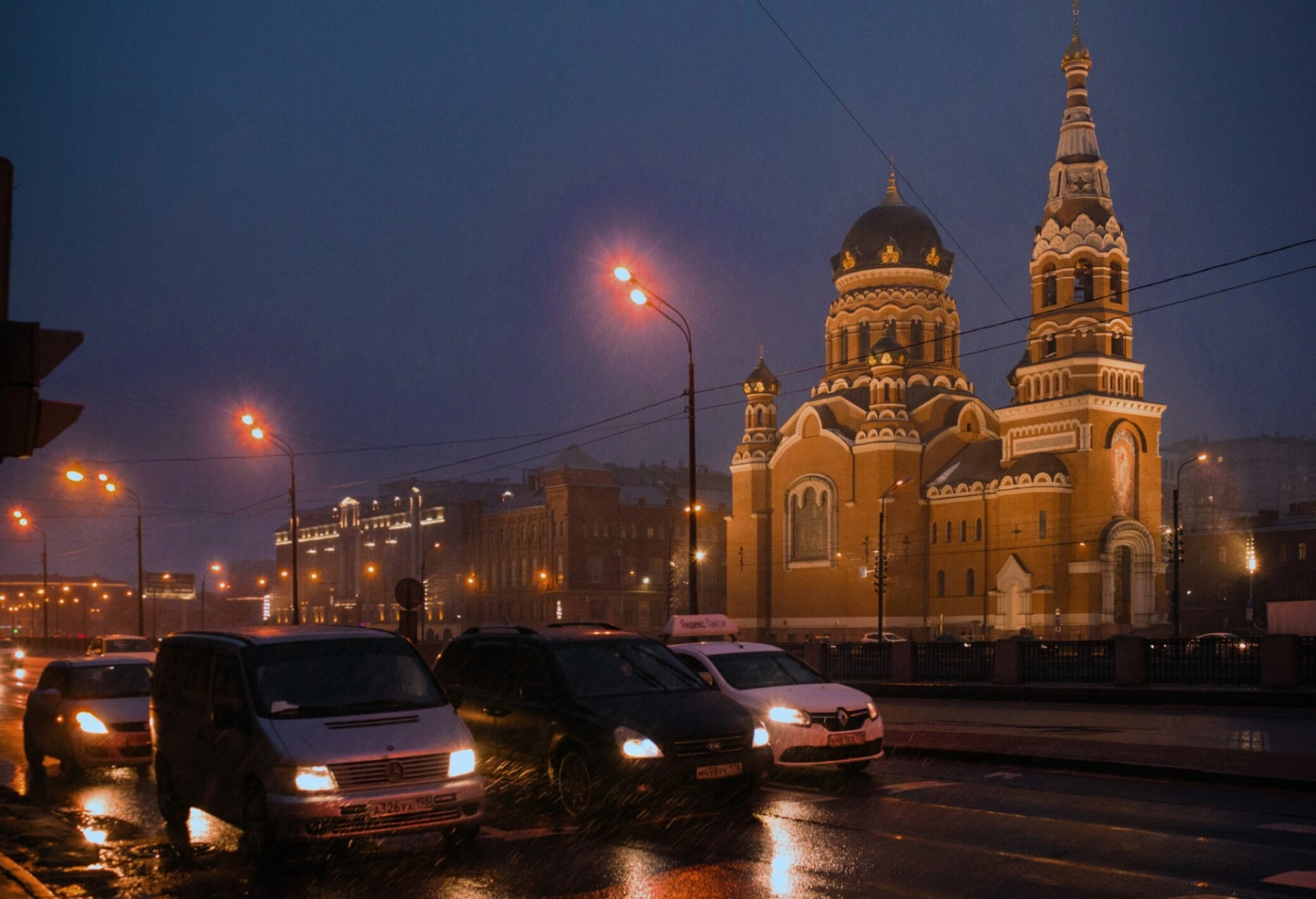 Передний план занимает мокрая асфальтированная дорога, отражающая свет уличных фонарей и фар проезжающих автомобилей. На снимке видны несколько машин, включая серебристый минивэн и тёмный внедорожник, чьи фары добавляют динамики композиции. Небо пасмурное, что типично для петербургской погоды, а тёплое искусственное освещение создаёт атмосферу уюта и благоговения.