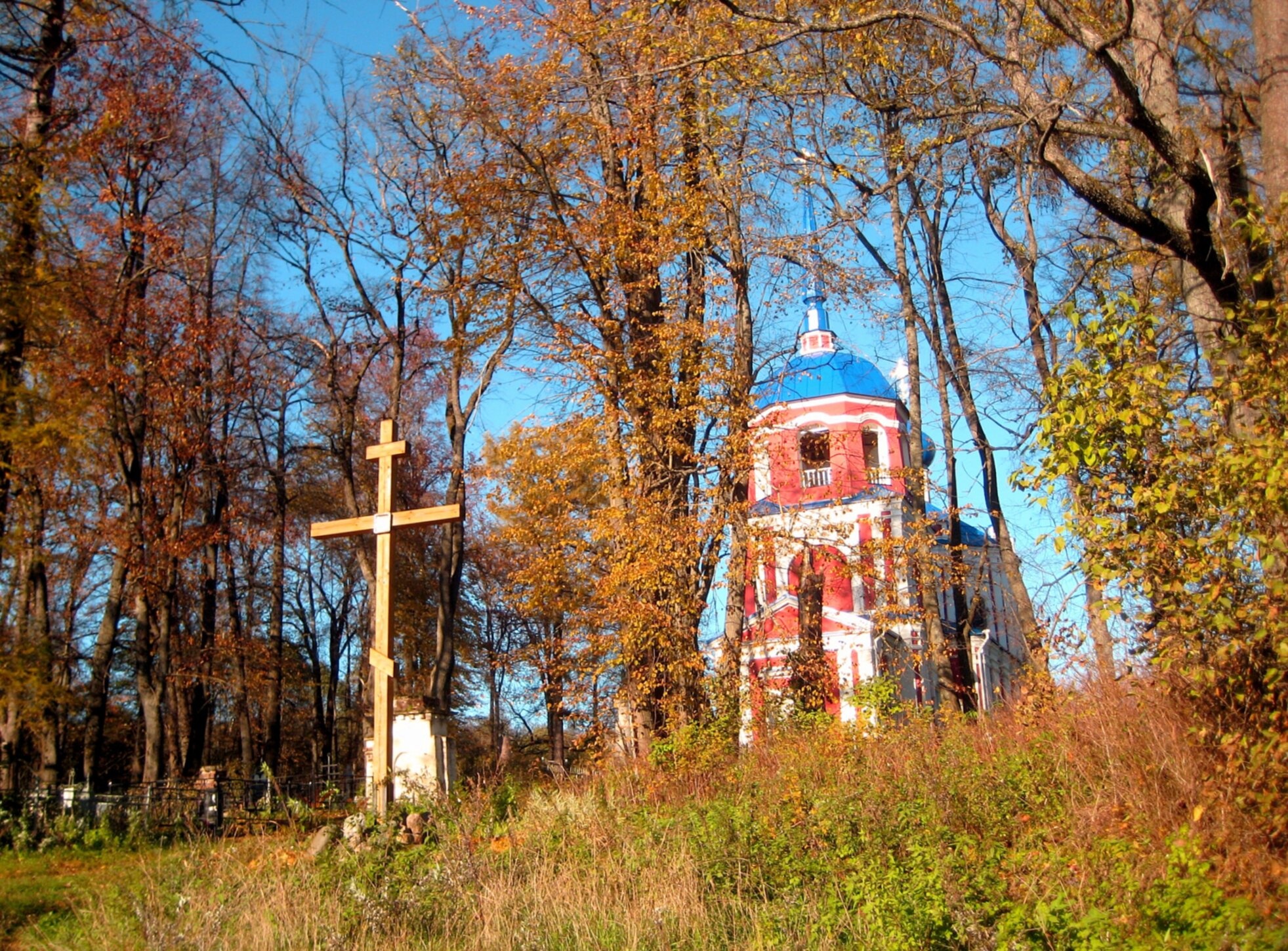 Святыня гармонично вписана в окружающий природный ландшафт. Осенняя пора одела прихрамовую рощу в золотой убор, подчёркивая благолепие и умиротворённость этого святого места. На переднем плане слева установлен большой деревянный поклонный крест, предназначенный для молитвенного поклонения верующих.