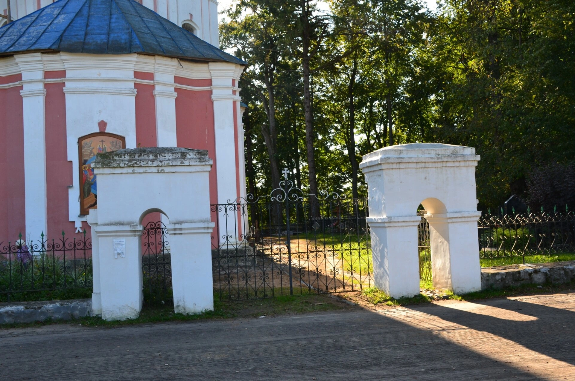 На представленной фотографии запечатлена ограда со Святыми вратами церковной территории храма Воскресения Христова, что располагается в древнем погосте Прутня, близ Торжка. Это намоленное место Тверской земли обладает глубокой исторической и духовной значимостью. Белоснежные каменные столбы и арочные ворота, увенчанные православными крестами, ведут на территорию погоста, где находится сама церковь.