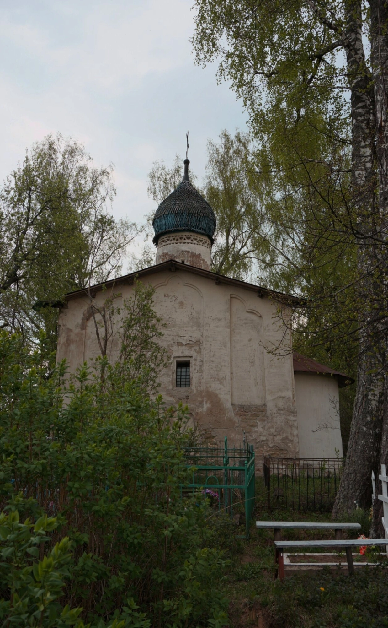 Территория вокруг храма благоустроена и ухожена. Рядом с церковью произрастают березы и кустарники, что создает живописный природный фон. На переднем плане фотографии видна часть скамейки и намогильный крест, свидетельствующие о наличии прихрамового кладбища, что является исторической традицией для многих православных приходов России.