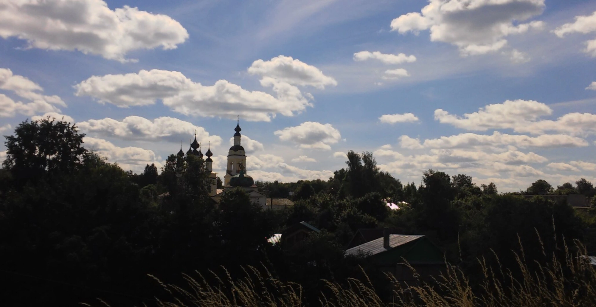 Храм гармонично вписан в окружающий ландшафт и окружён зеленью, что подчёркивает его единение с творением Божиим. Снимок сделан в ясный день, и на фоне облачного неба силуэт церкви смотрится особенно величественно и одухотворённо, напоминая о вечных ценностях и благодати Божией, изливаемой на всех предстоящих перед ней.
